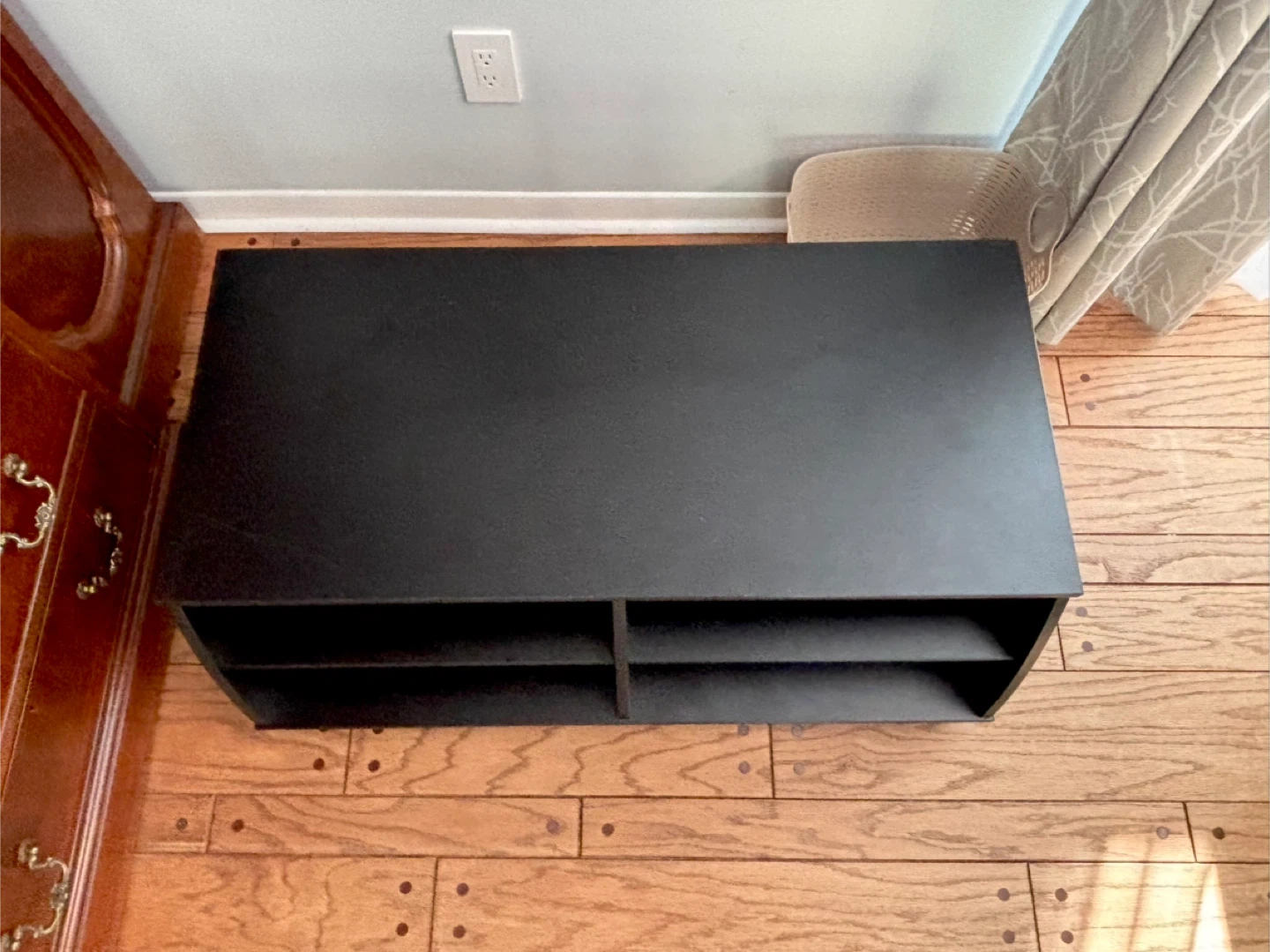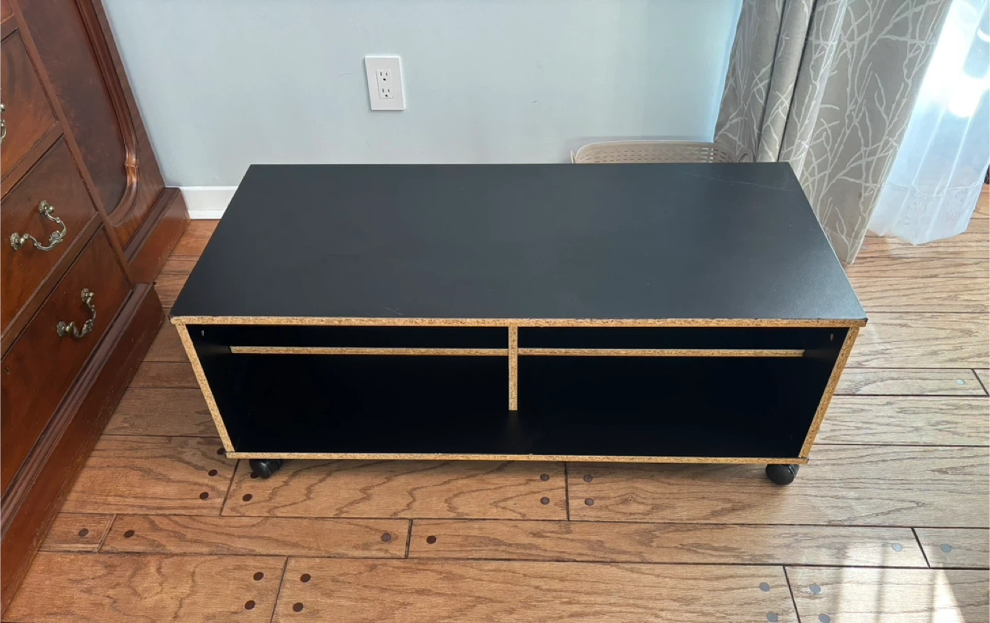 Selling a black TV stand or media console. It has a simple design with four divided shelves and sits on wheels for easy moving. It's clean and in good condition .