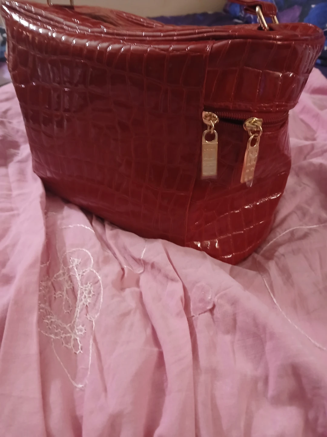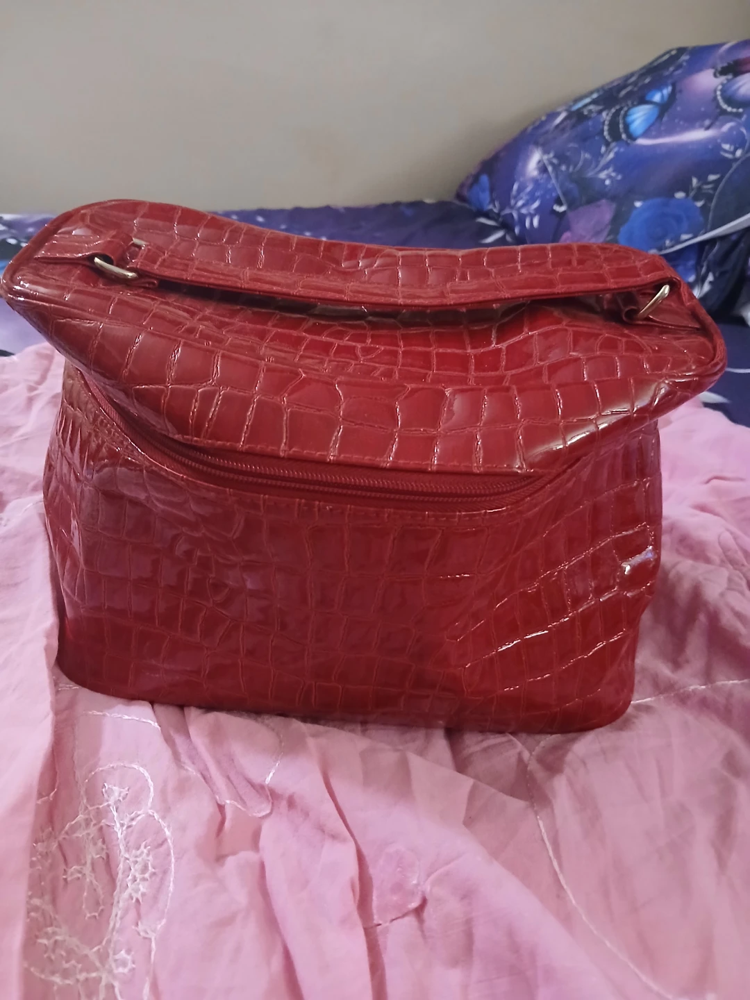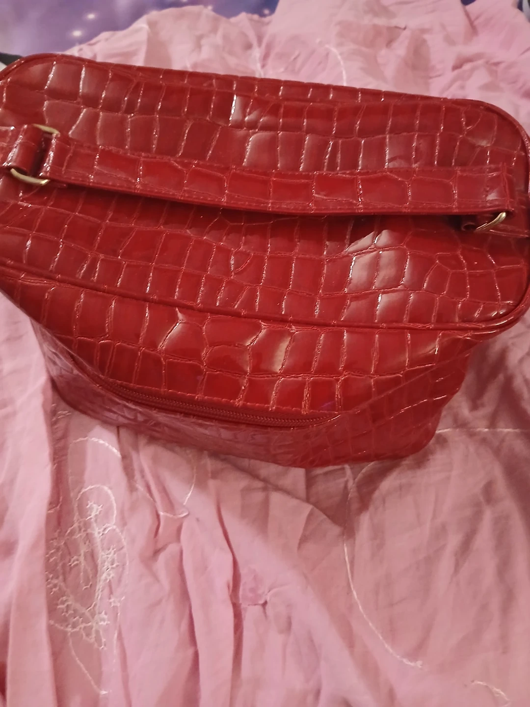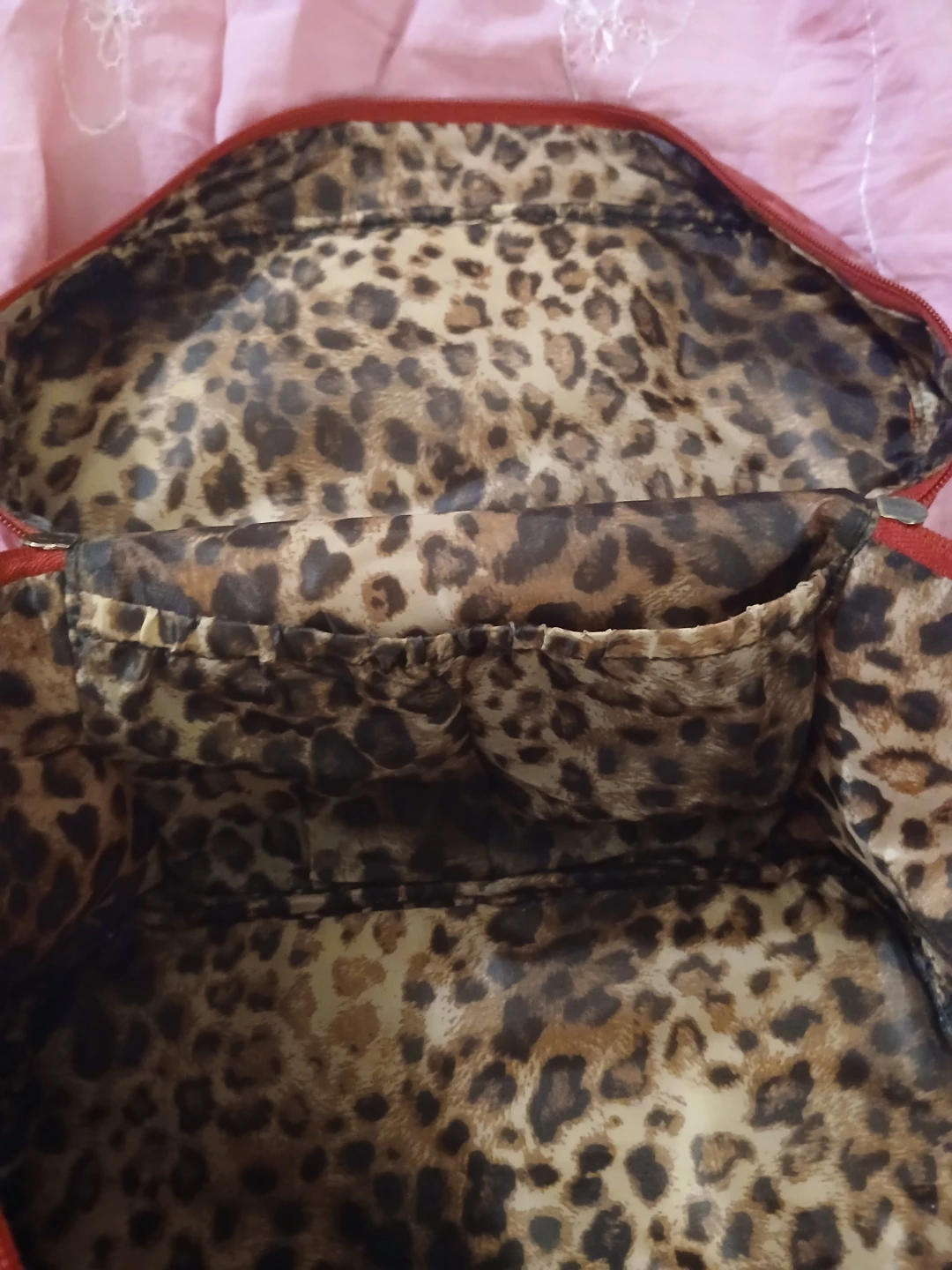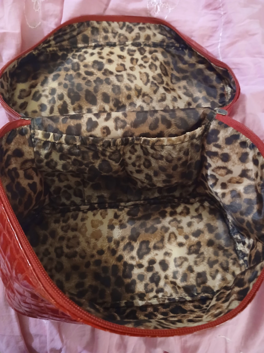 This is a red cosmetic bag with a croc-embossed exterior. The interior has a fun leopard print lining and several pockets to keep everything organized