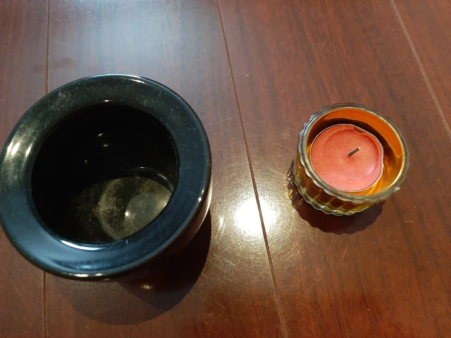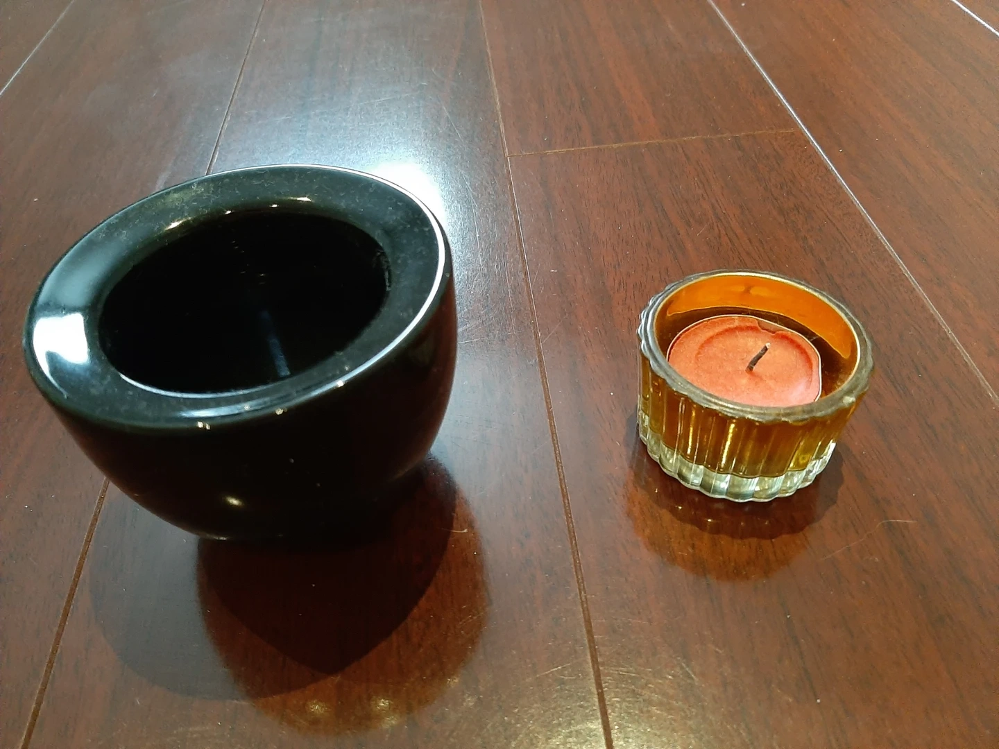 Selling a set of two candle holders. One is a sleek black bowl shape, and the other is a ribbed glass holder with a warm amber hue. Perfect for adding a cozy touch to any room!