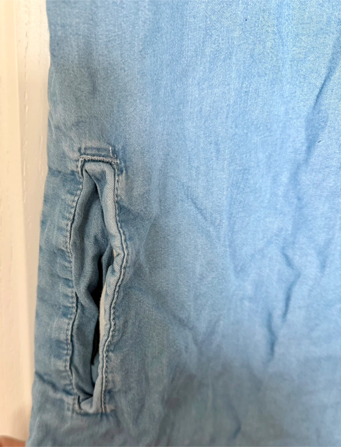 It's a light blue colour and made of denim material.