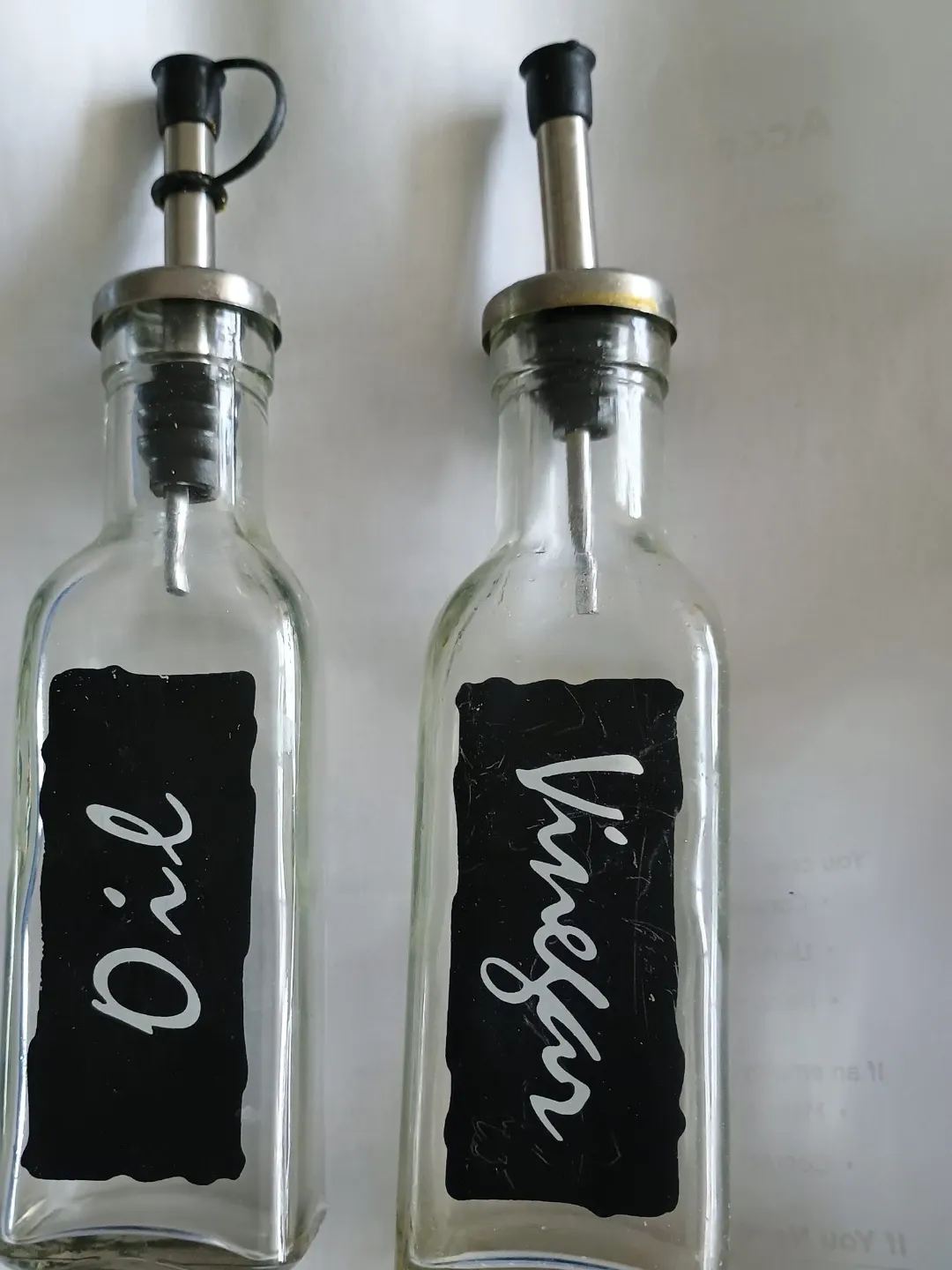 Selling a set of glass bottles, perfect for storing and dispensing oil and vinegar! They add a touch of elegance to your kitchen or dining table. The bottles are in great condition and ready to use