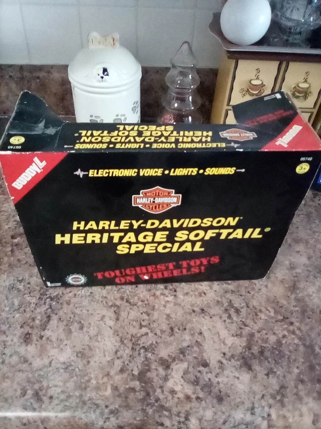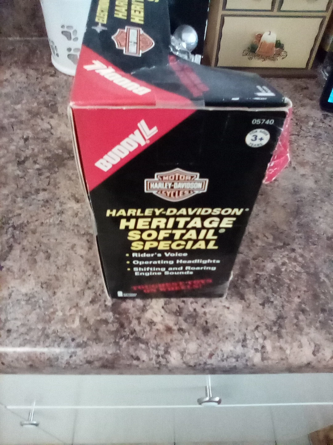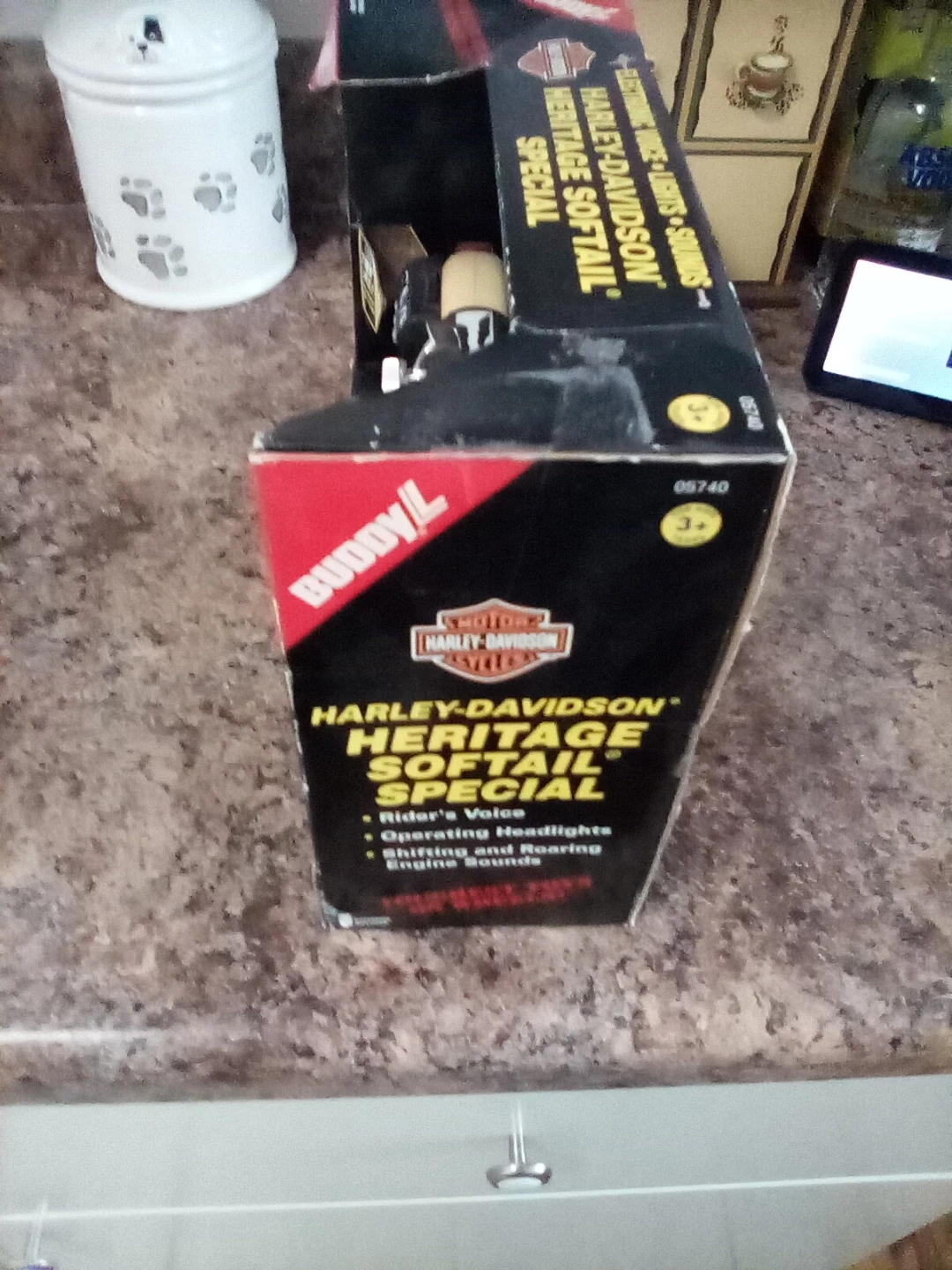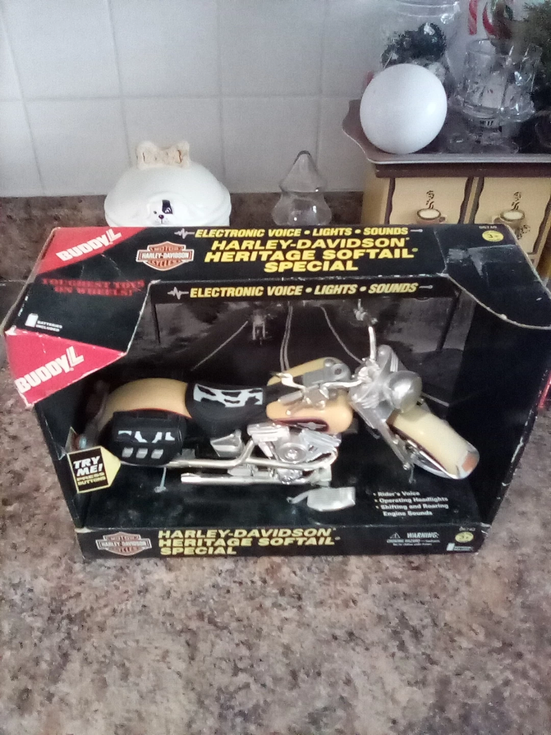 Selling a Buddy L Harley-Davidson Heritage Softail Special toy motorcycle! It features electronic voice, lights, and sounds. It's still in the original box, ready for a new home with a motorcycle enthusiast or collector..It has never been taken out of the box but some obvious were on the box during moves.You will need new batteries.