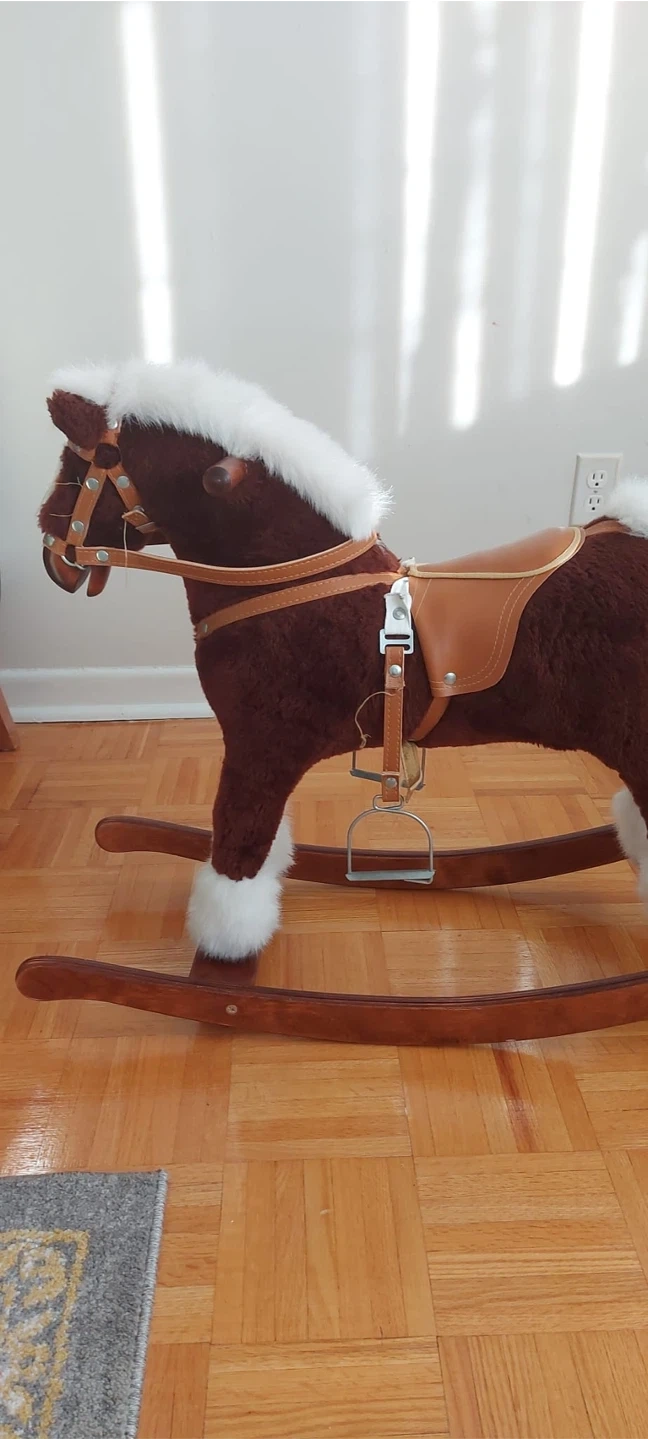 A classic rocking horse, perfect for a child's room or playroom! It features a brown plush body with white accents, a faux leather saddle, and wooden rockers. It's in great shape and ready for a new home!