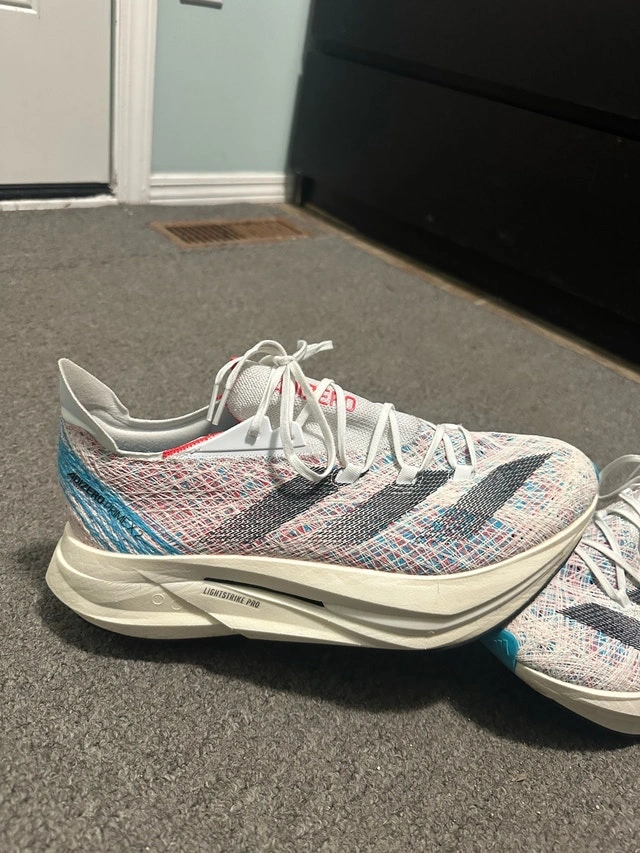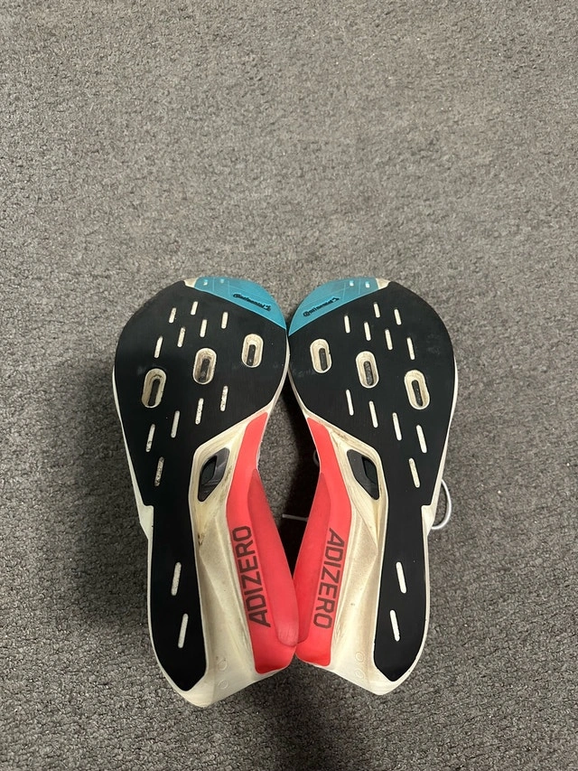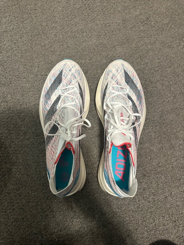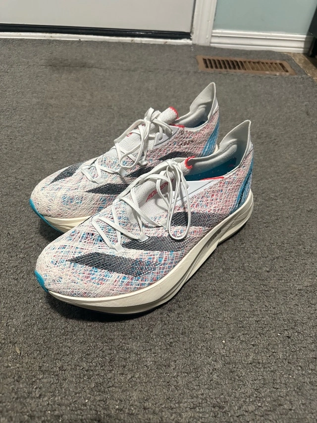 Get ready to fly in these Adizero Prime X2 running shoes, size 11.5 US. These shoes feature a responsive midsole and a grippy outsole, perfect for road running. These shoes are in great condition as seen in the pictures. Here are some of the specs: