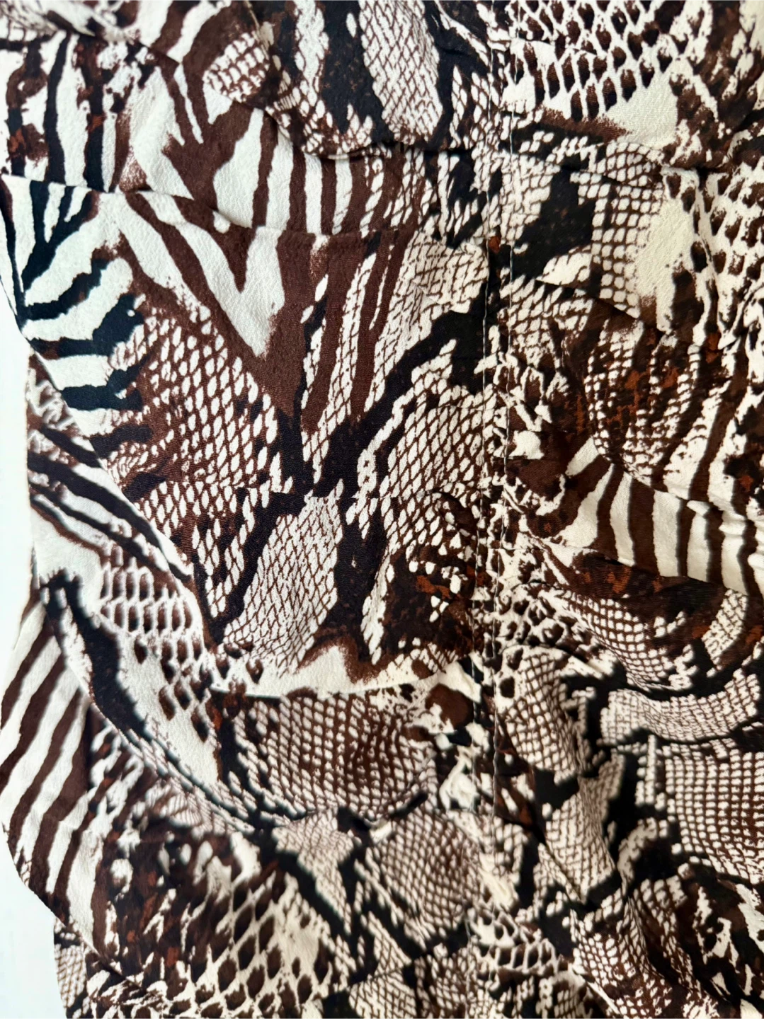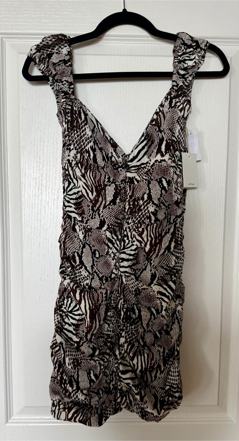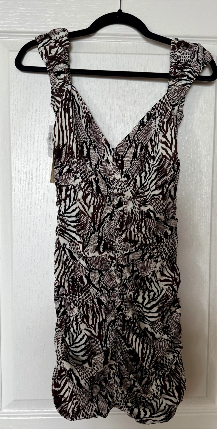 It features a unique animal print design with a V-neckline and ruched detailing.