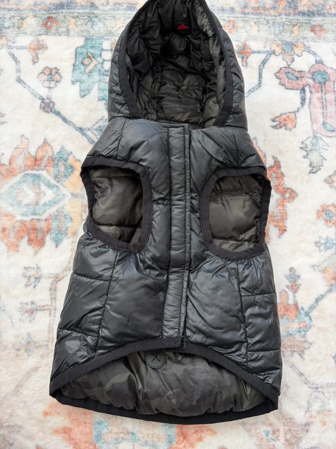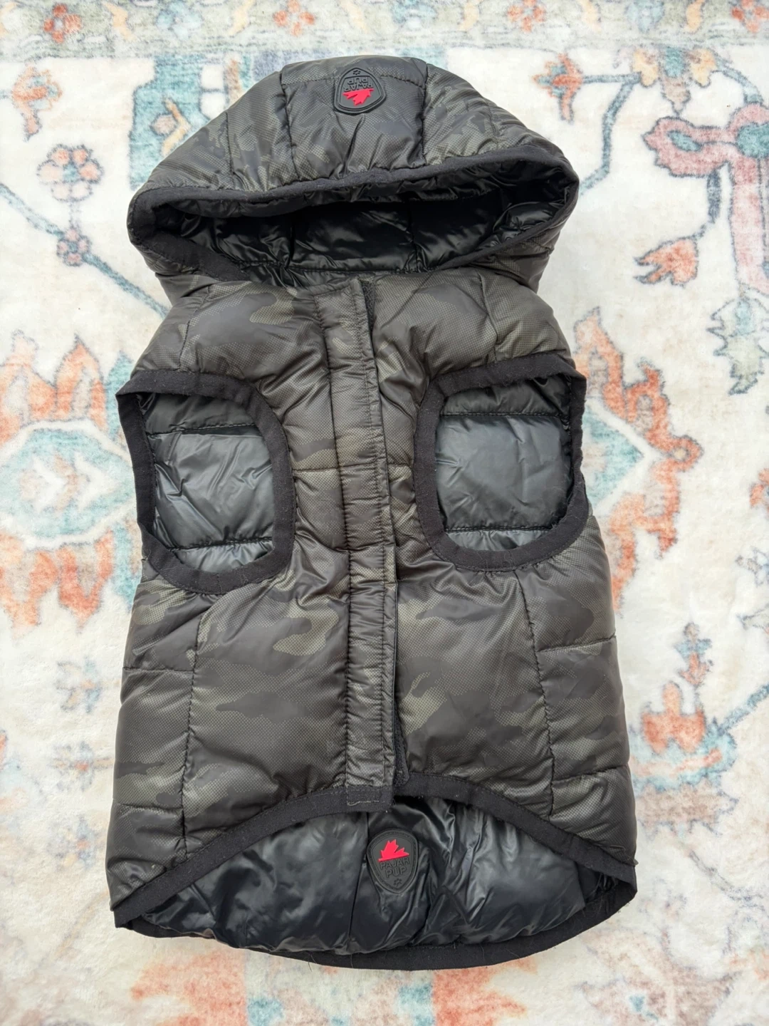Keep your furry friend warm and stylish with this Pajar Pup puffer vest. It's perfect for those chilly Canadian walks. Reversible pattern - black and camo. Also has a handy pouch to keep poop bags. Size Medium.