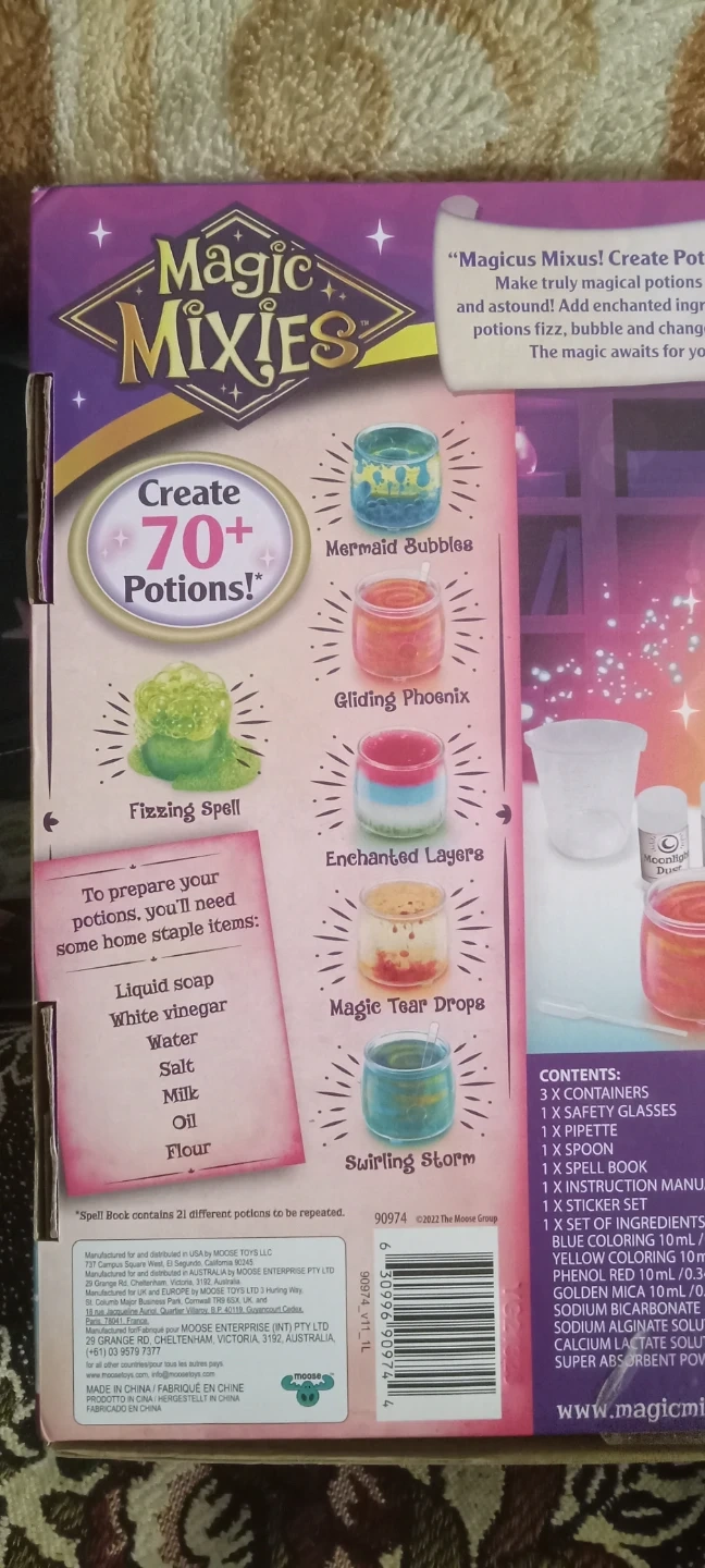 Create over 70+ potions with the Magic Mixies Magic Potions Kit! It's designed for ages 8 and up. The box includes containers, safety glasses, a pipette, a spoon, a spell book, an instruction manual, a sticker sheet, and a set of ingredients, including blue, yellow, red, and super absorbent powder