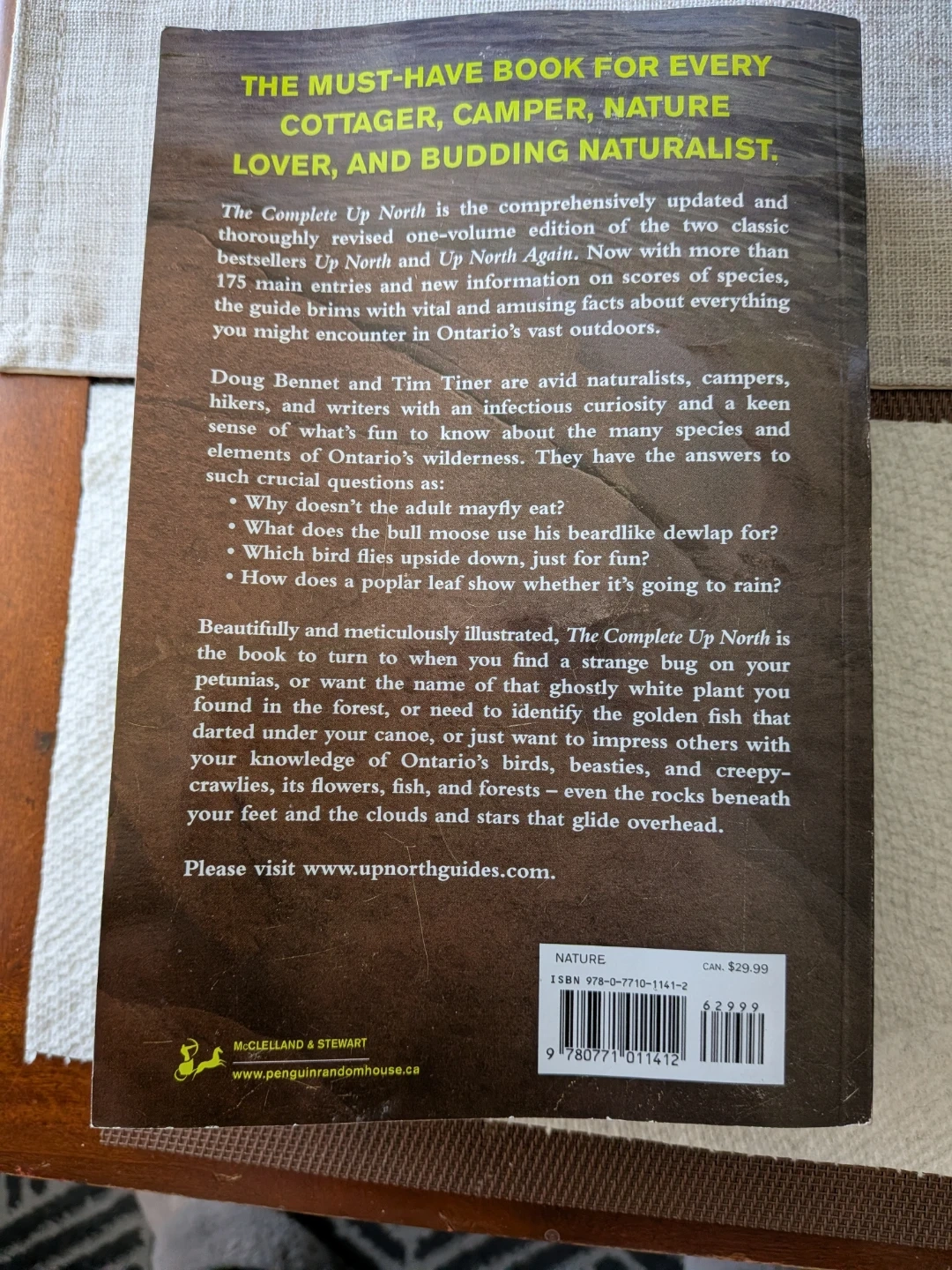 Selling a copy of 'The Complete Up North: A Guide to Ontario's Wilderness from Black Flies to the Northern Lights' by Doug Bennet and Tim Tiner. It's a great book for cottagers, campers, nature lovers, and budding naturalists! It covers everything from creepy-crawlies to trees, plants, day sky, and night sky. A must-have for exploring Ontario's vast outdoors