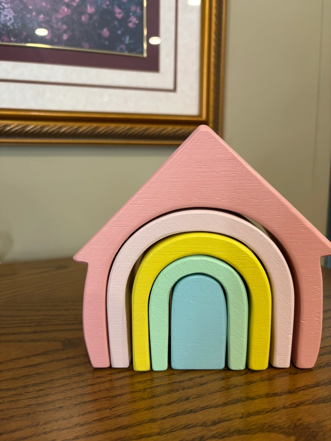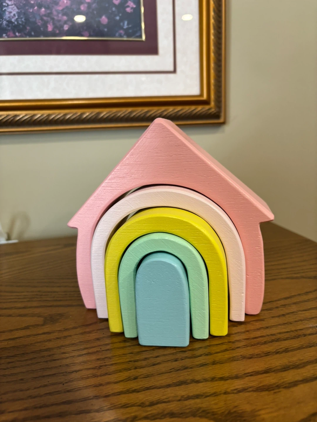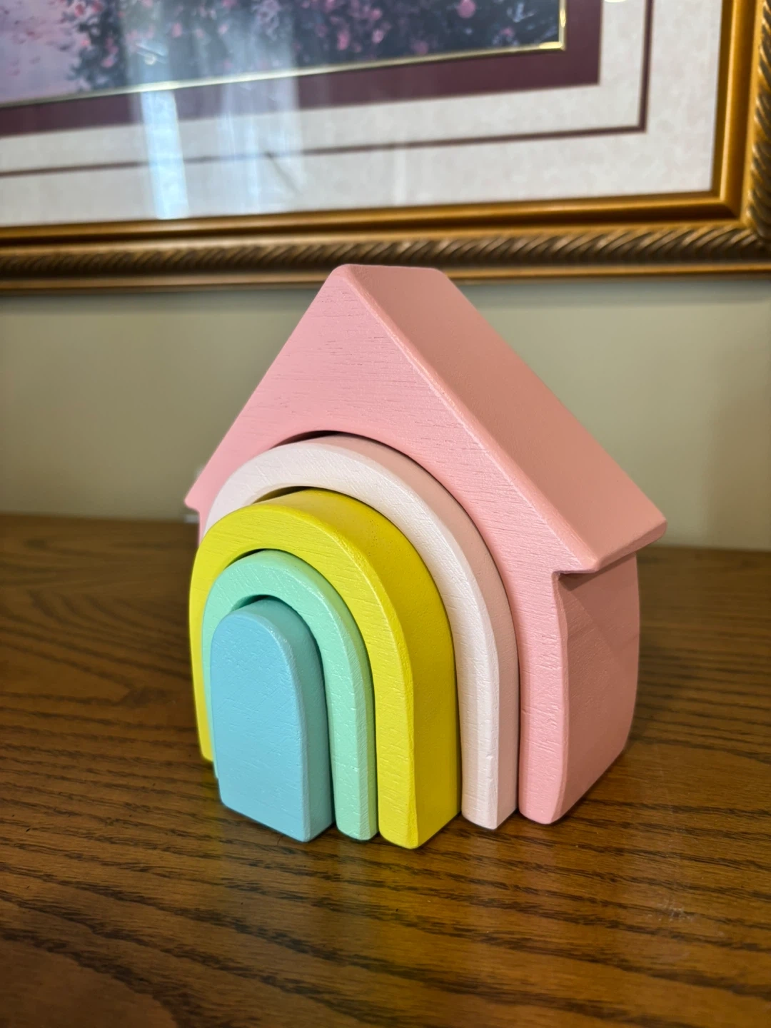Beautiful wooden stacking toy shaped like a little house with a pastel rainbow inside. Made from solid wood with smooth edges and soft, calming colors.