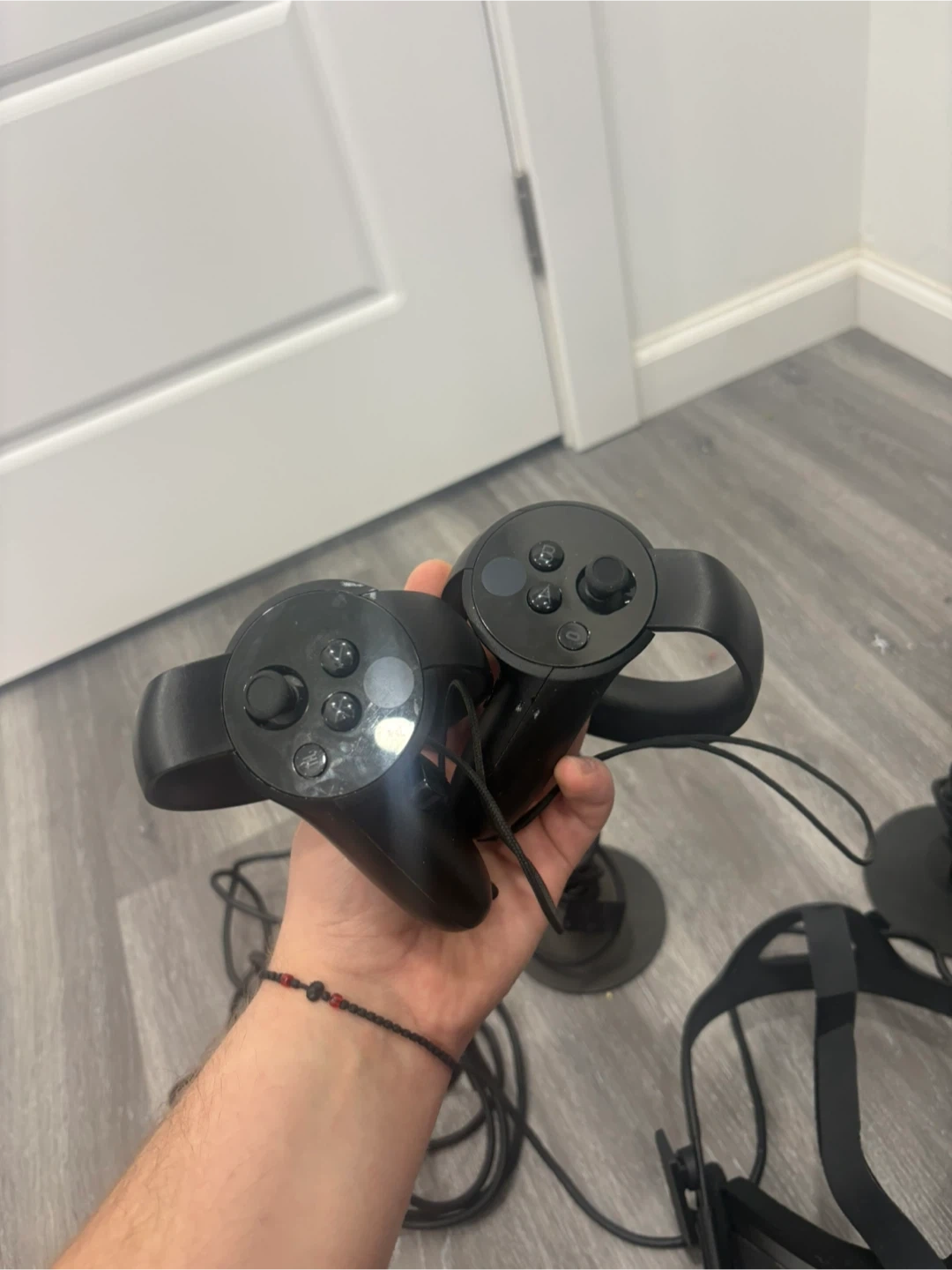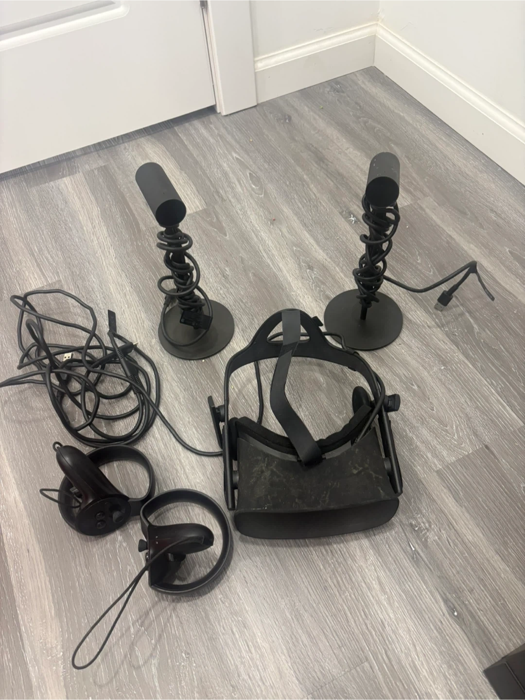 Selling a used Oculus Quest 1 VR headset. It comes with the headset, two controllers, and two stands. Great for exploring virtual reality!