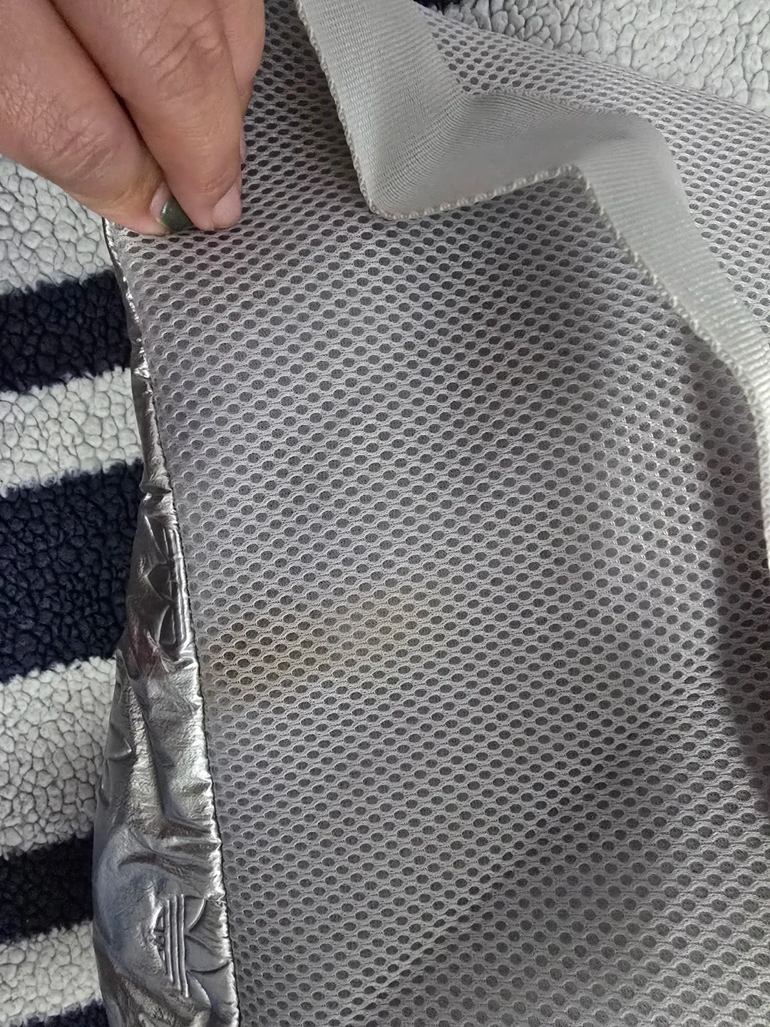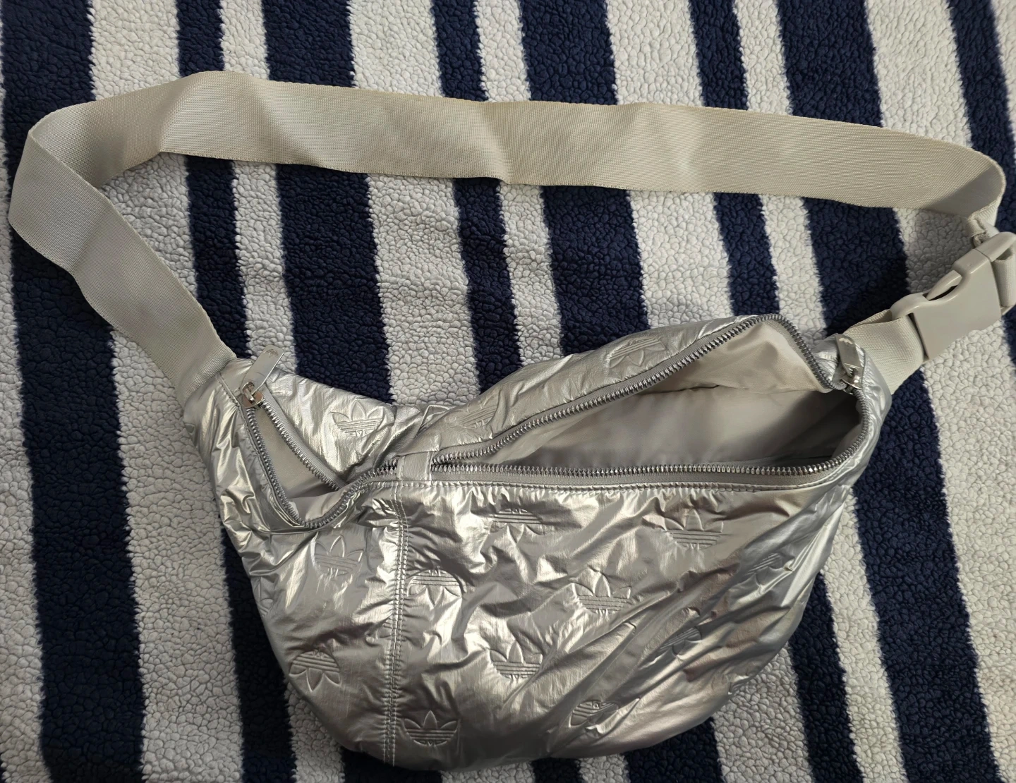 Selling a stylish Adidas waist bag in silver, with brown stains as it has been used. It is in good condition, no rips, no holes just the stains on the back and straps.
