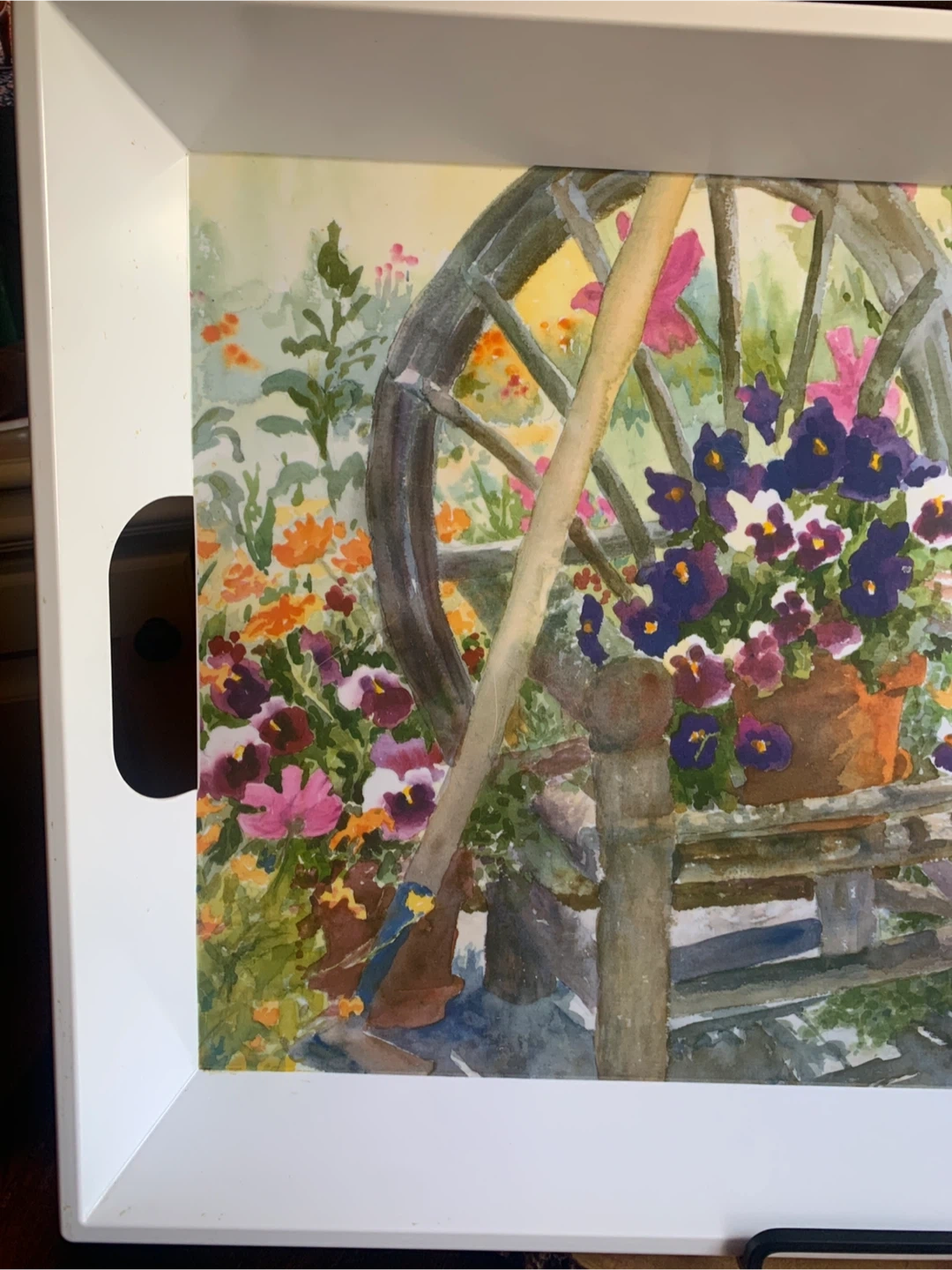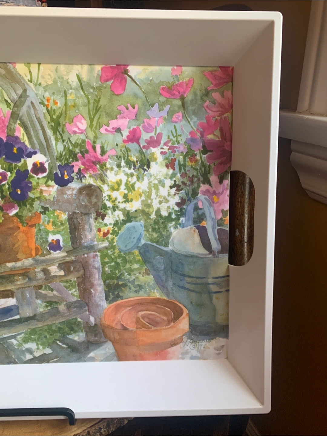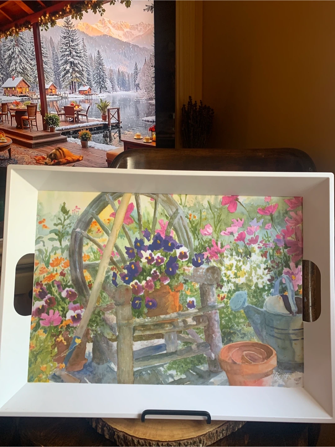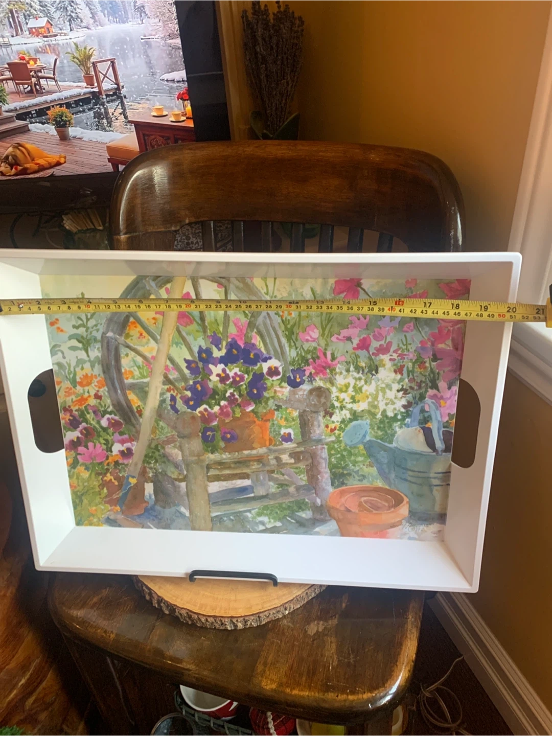 Vintage 1995, by Judy Buswell, Floral Garden R2S Spa Made in Italy. The tray is melamine with Integrated handles. It features a charming garden scene with flowers, a garden chair, and a watering can. The tray has a white frame that is in good condition with just a few spots of wear. The tray is perfect for adding a touch of spring to your home decor!