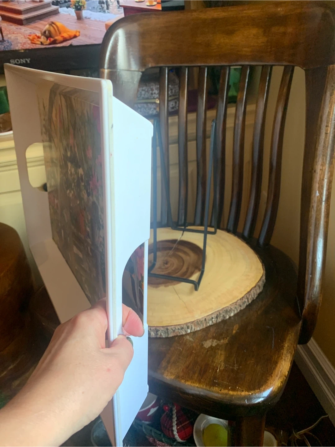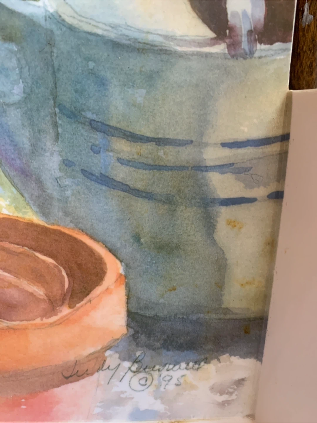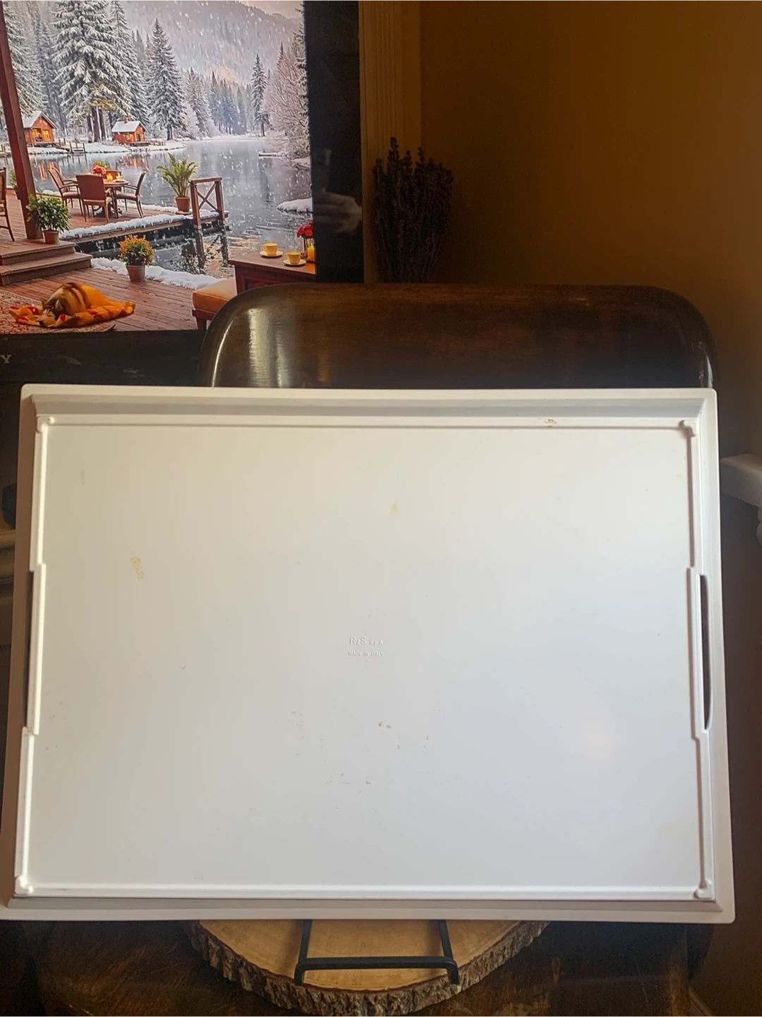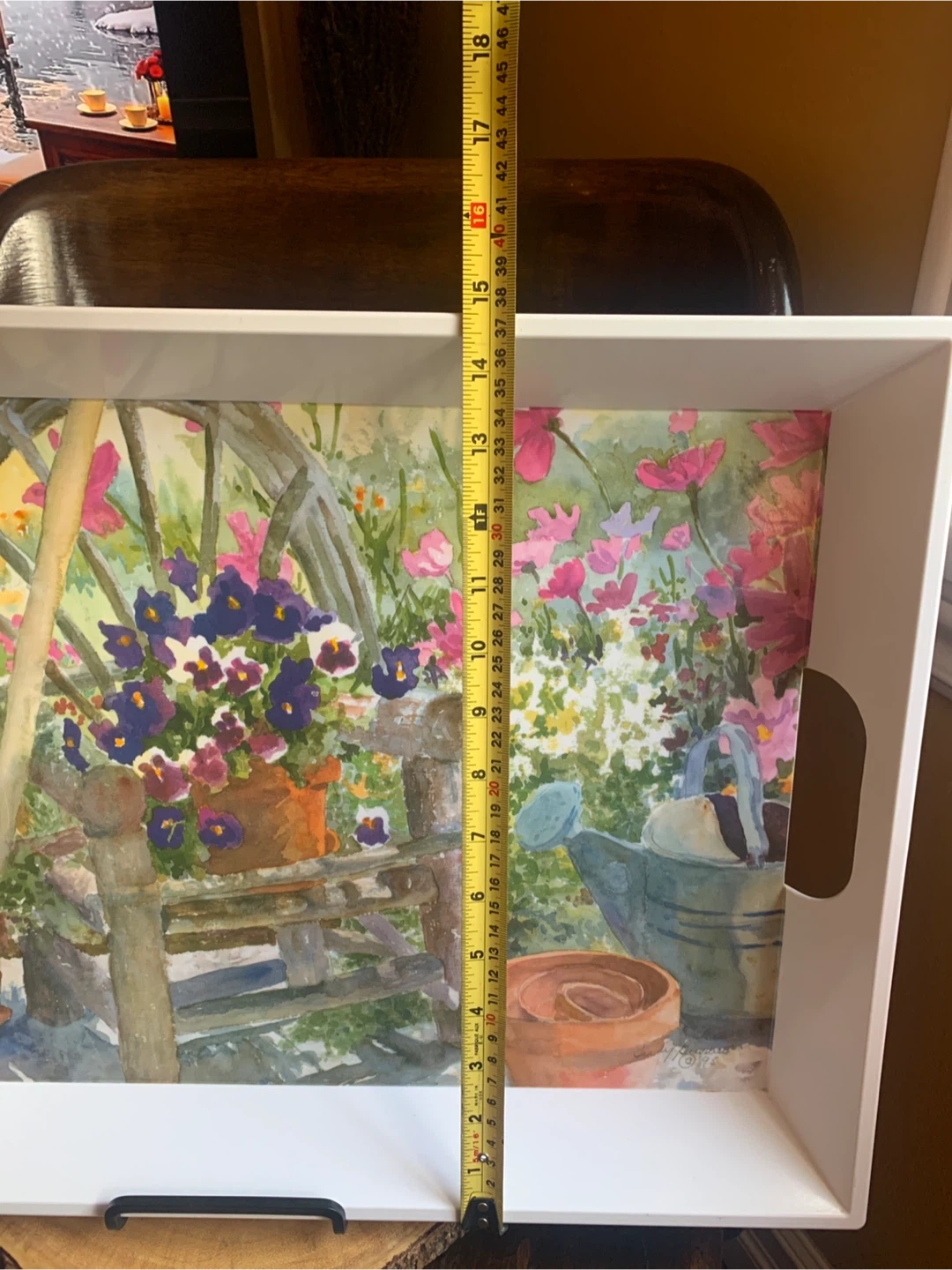 Vintage 1995, by Judy Buswell, Floral Garden R2S Spa Made in Italy. The tray is melamine with Integrated handles. It features a charming garden scene with flowers, a garden chair, and a watering can. The tray has a white frame that is in good condition with just a few spots of wear. The tray is perfect for adding a touch of spring to your home decor!