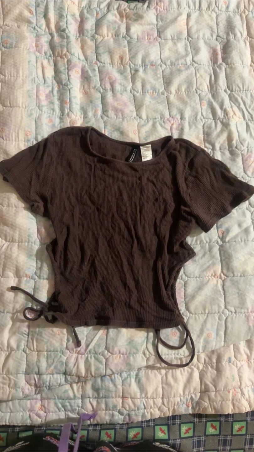 Selling a cute H&M brown ribbed top with tie-up details on the sides! It's a size small and in great condition. Perfect for adding a little something extra to your outfit