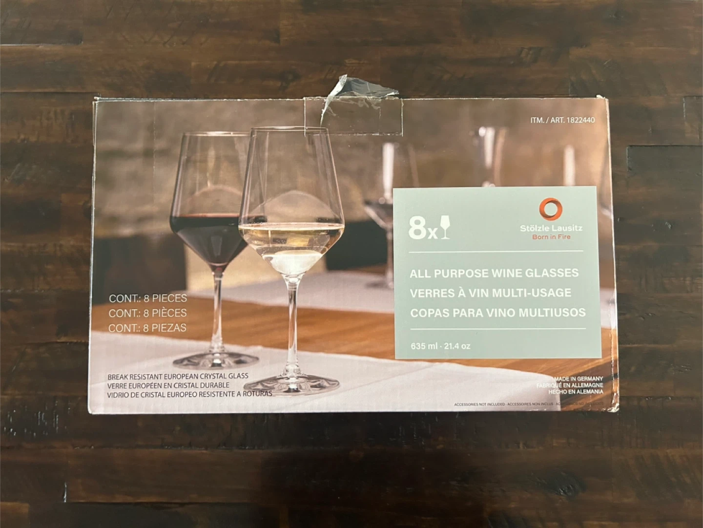 Set of eight Stölzle Lausitz all-purpose wine glasses. Glasses are made of break-resistant European crystal glass and have a capacity of 635 ml (21.4 oz).
