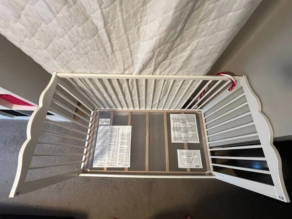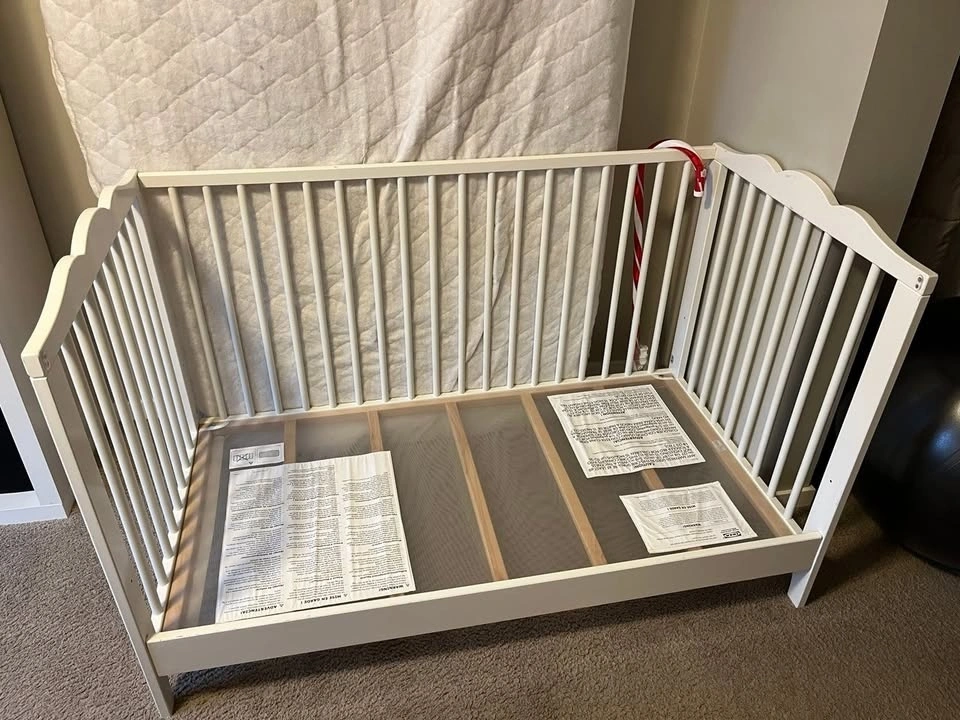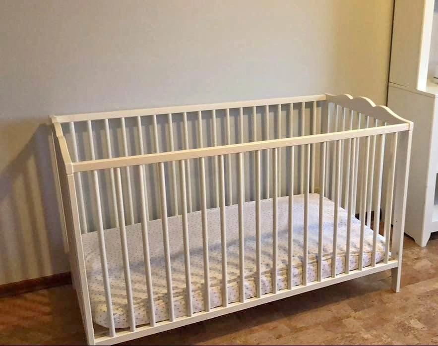 Convertible crib toddler bed with multiple mattress heights and the option to remove one crib wall.