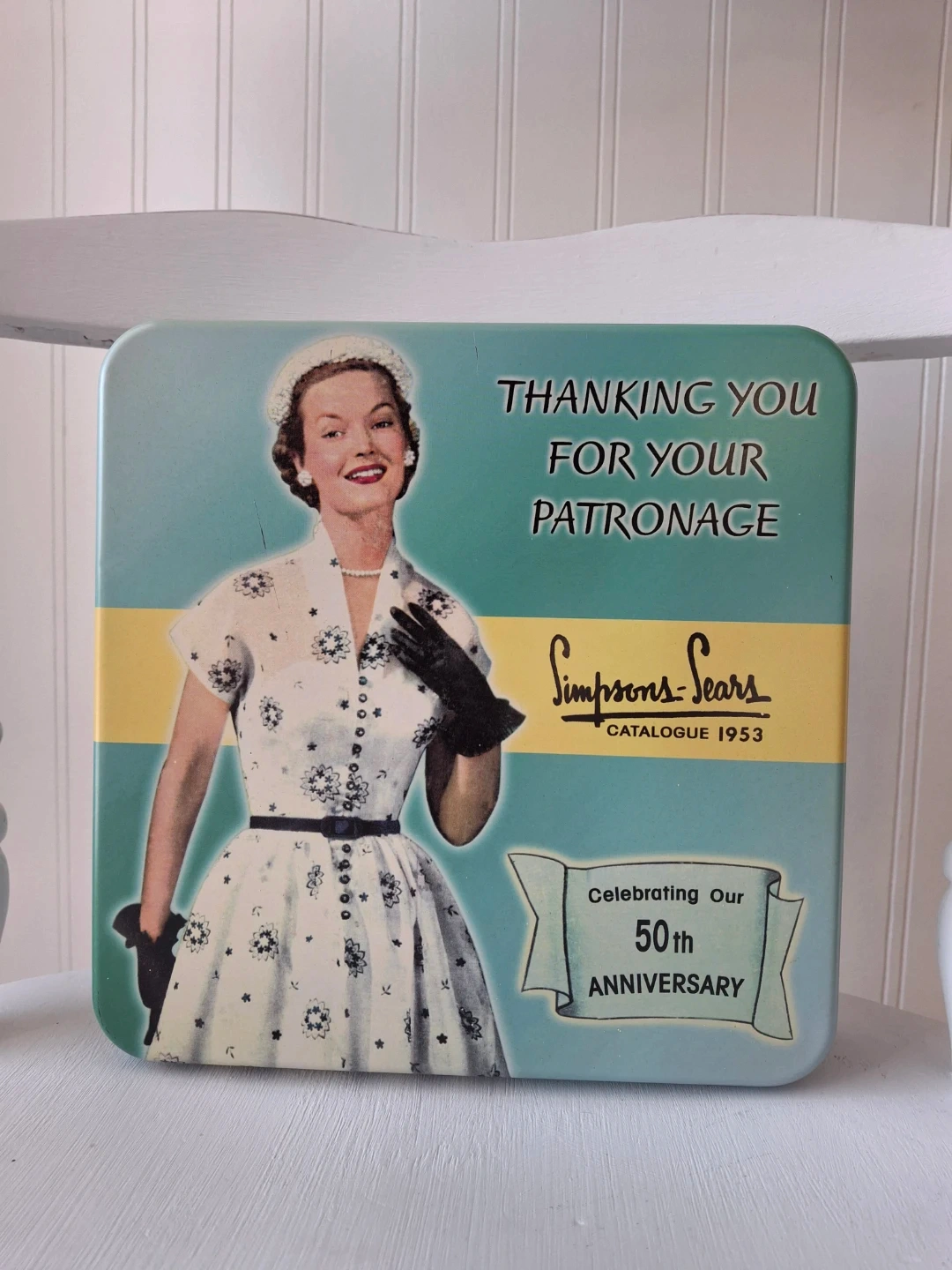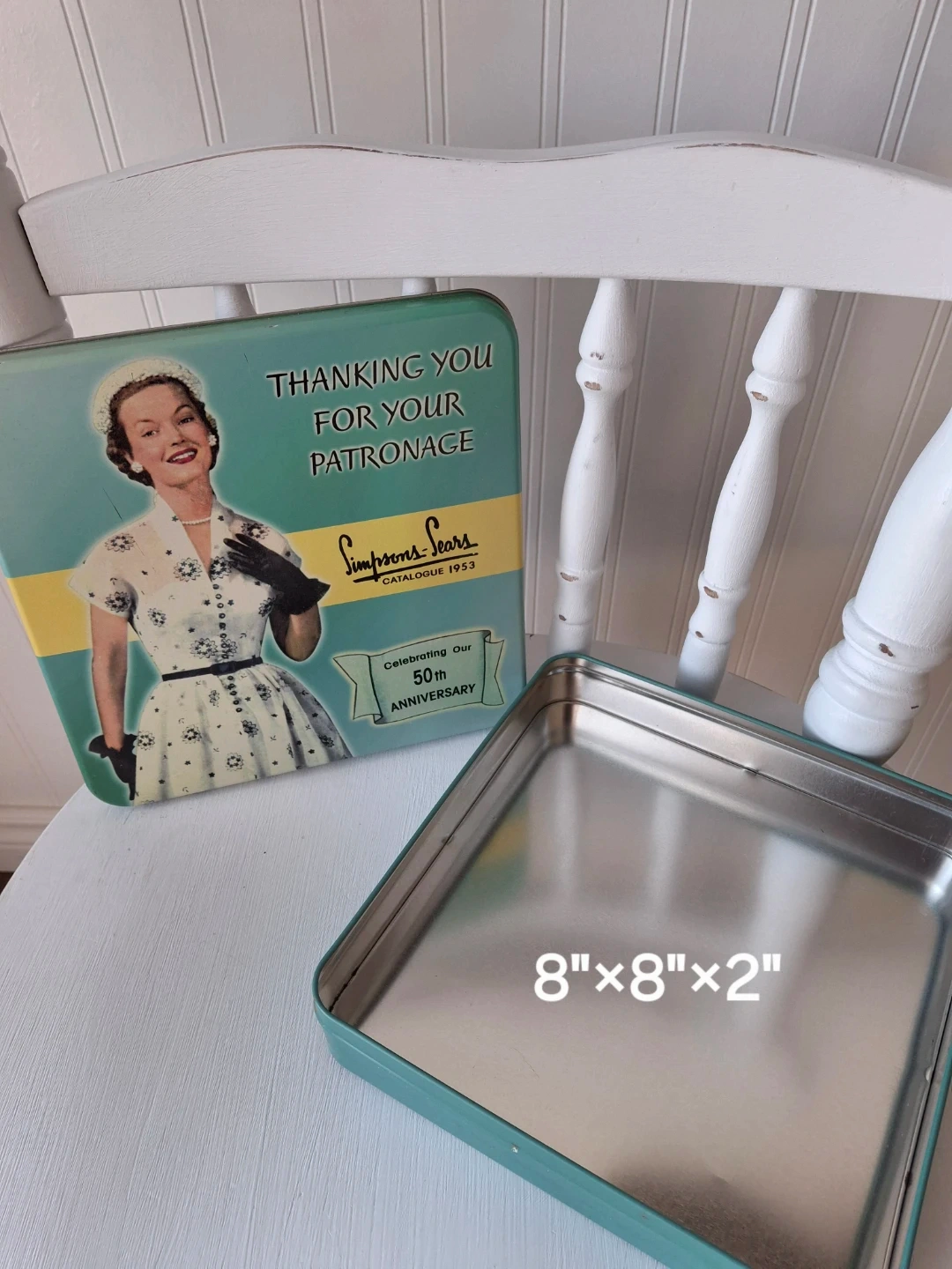 Selling a vintage Simpsons-Sears Catalogue 1953 tin box. It's in great condition and measures 8" x 8" x 2". This tin is celebrating the 50th anniversary of the catalogue!