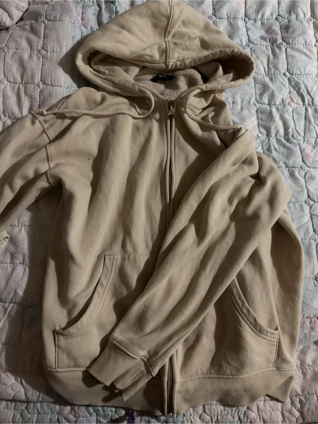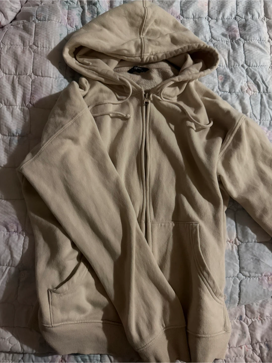 Cozy beige zip-up hoodie. It's in great condition and perfect for layering on those cooler days. The material is soft and comfortable, making it a great addition to your wardrobe
