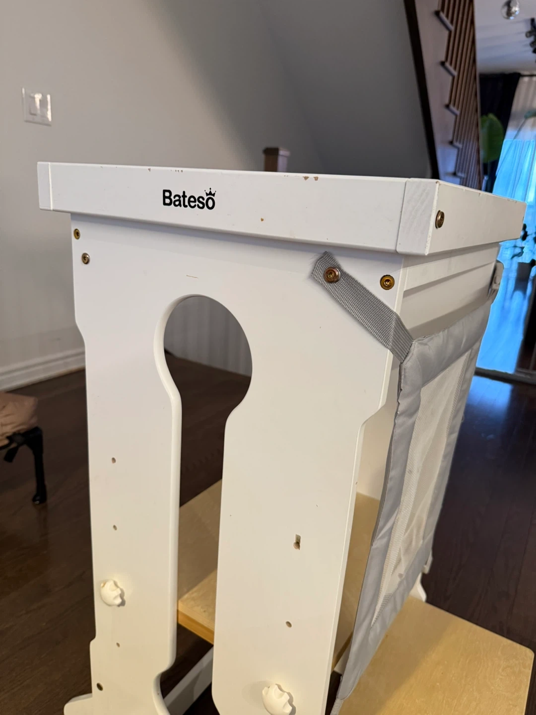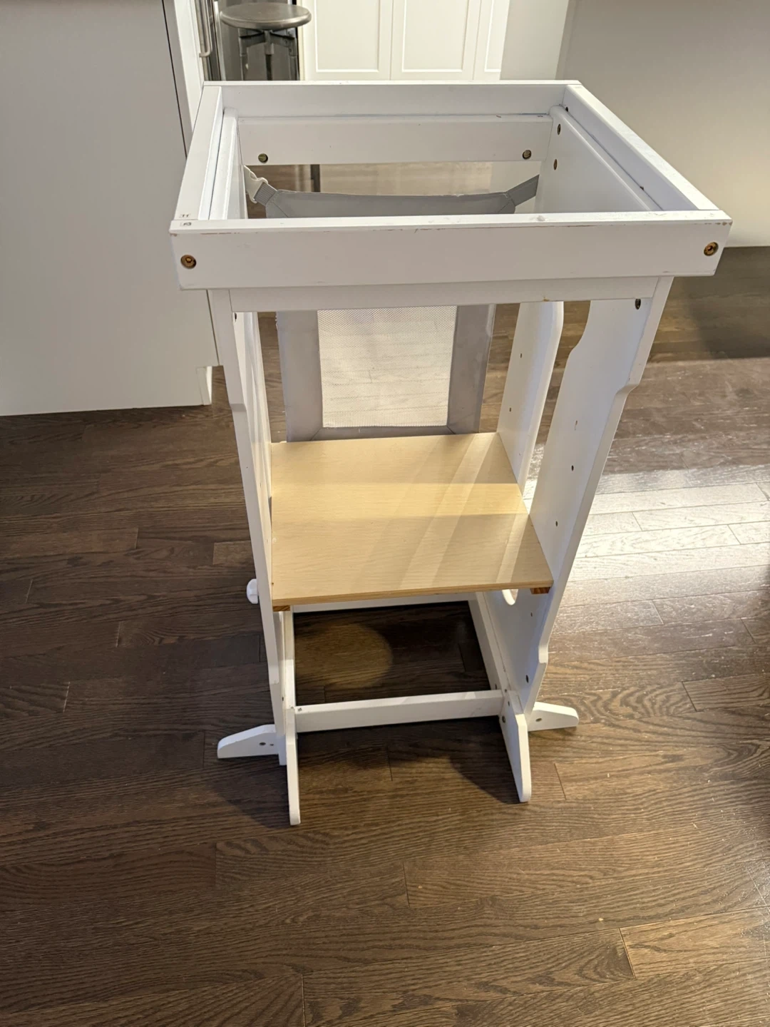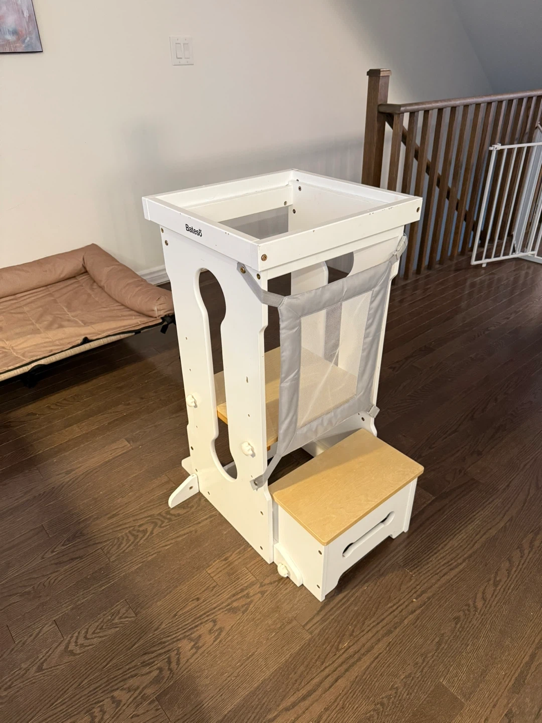 Selling a Bateso kids kitchen step stool. It's in great condition and perfect for helping your little one reach the counter safely. The stool is white with a natural wood step and features a safety net for added security. Great for ages 18 months and up!