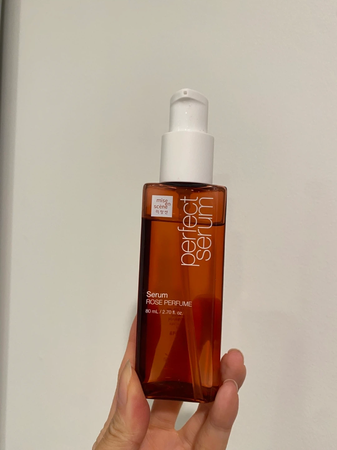 Mise En Scène Perfect Serum in the Rose Perfume scent! It comes in an 80ml bottle. This serum is made in Korea and is designed to rejuvenate your hair with a lovely rose fragrance