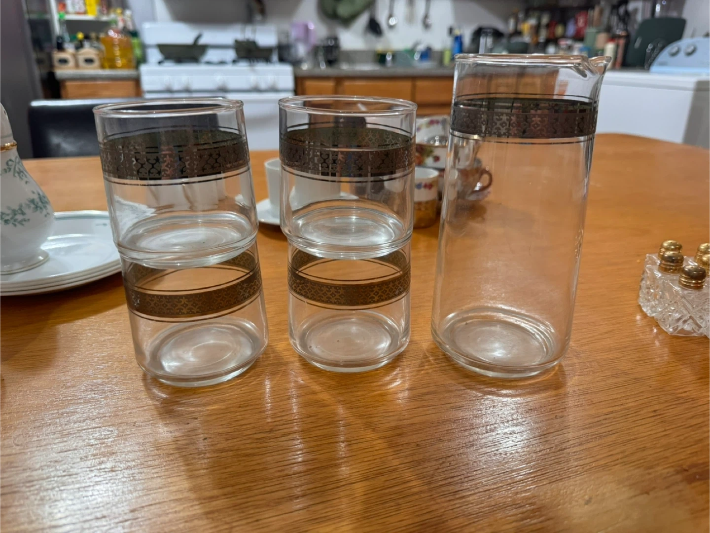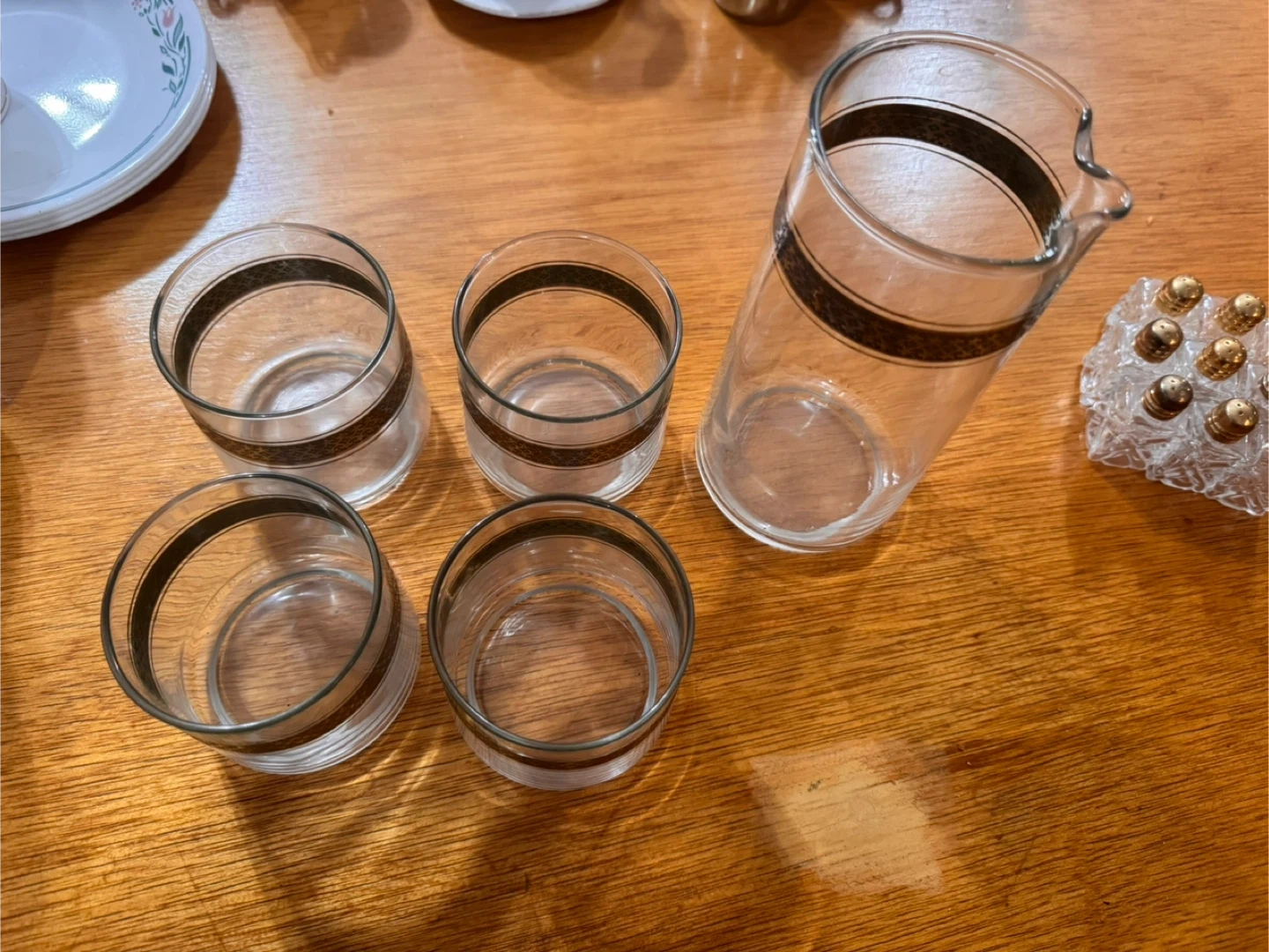 Selling a vintage pitcher and glasses set. This set features a clear glass design with a gold and black decorative band around the top and bottom of each piece. Perfect for adding a touch of retro charm to your home!