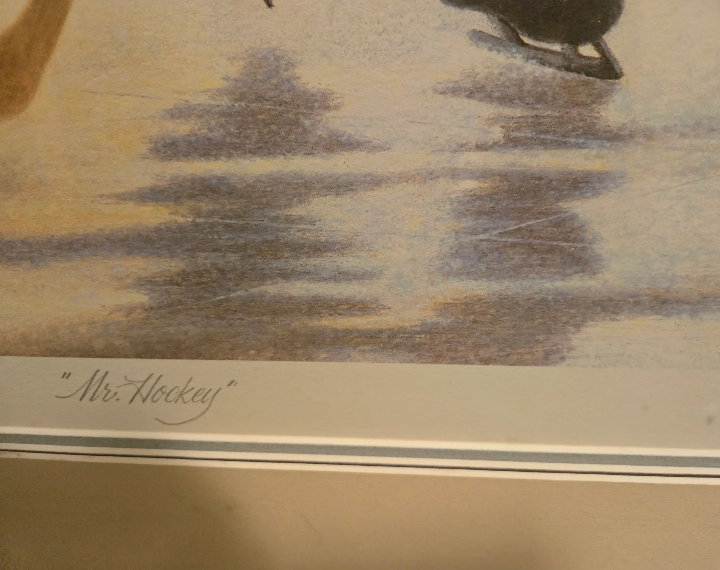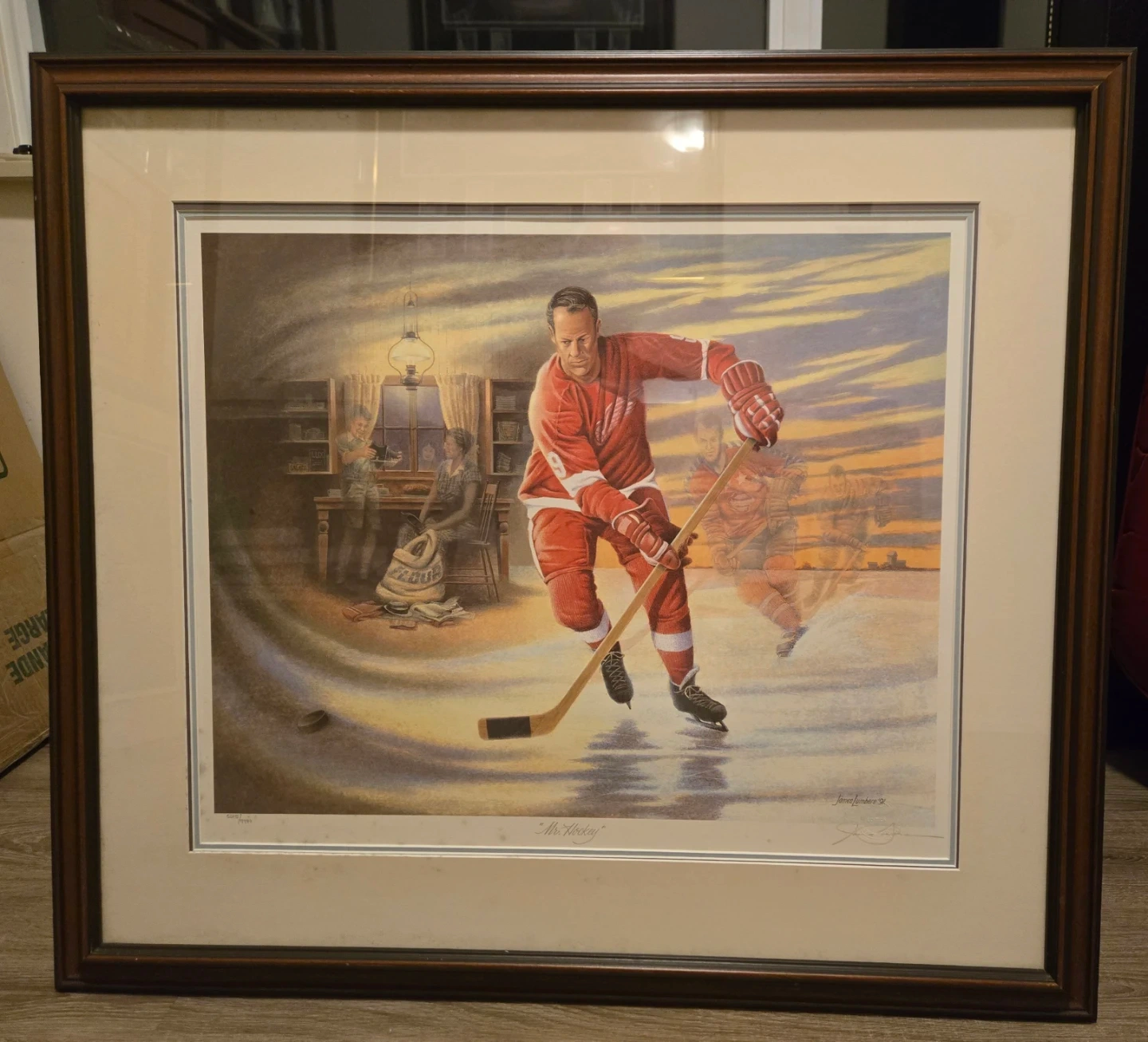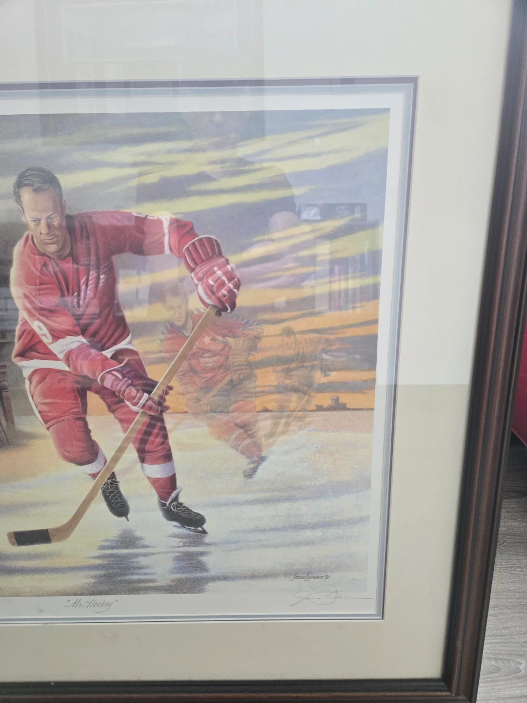 Selling a framed art print signed by James Lumbers. Mr Hockey Gordie Howe Limited Edition. Im selling the framed print for a low price as it has imperfections, especially bottom left where numbering 5015/9999 Area has some spotting on print and mat. Not sure what it is, not sure if it can be opened up and cleaned off. Therefore selling as is for Only $50 Firm. Cash on Pickup. Other than the spotting marks the print and frame are in great condition.