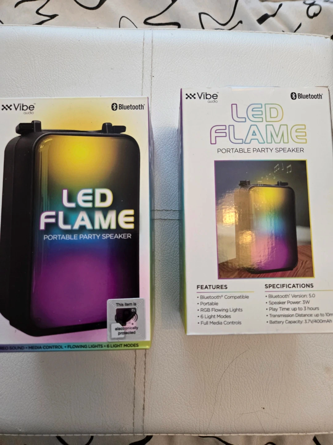 Selling a brand new Vibe Audio LED Flame portable party speaker! It's Bluetooth compatible and features RGB flowing lights with 6 light modes. You can control the media easily, and it has a playtime of up to 3 hours. The Bluetooth version is 5.0, with a speaker power of 3W. Transmission distance is up to 10m, and the battery capacity is 3.7V/400mAh. Box included