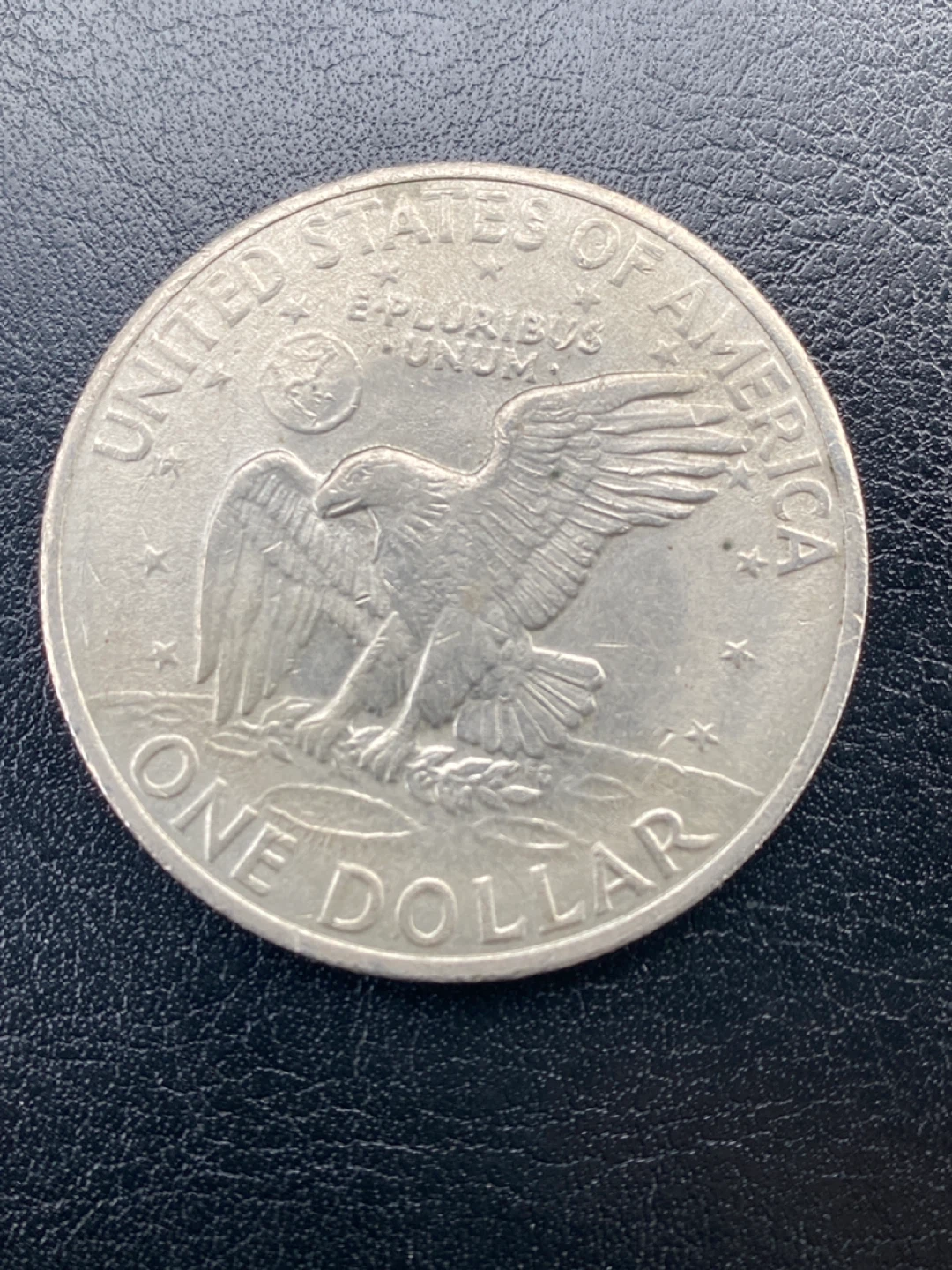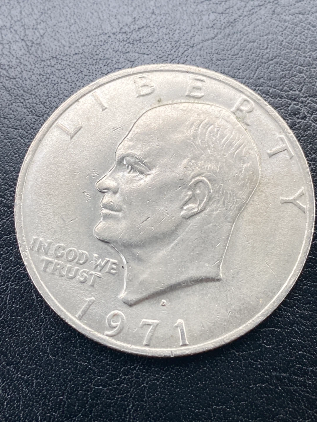 Selling a 1971 Eisenhower Dollar coin. It features the image of Dwight D. Eisenhower, the 34th President of the United States. The coin also has the words 'Liberty' and 'In God We Trust' inscribed on it