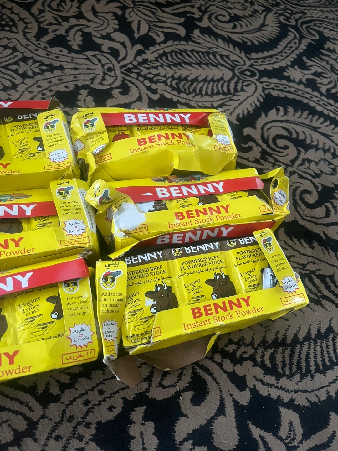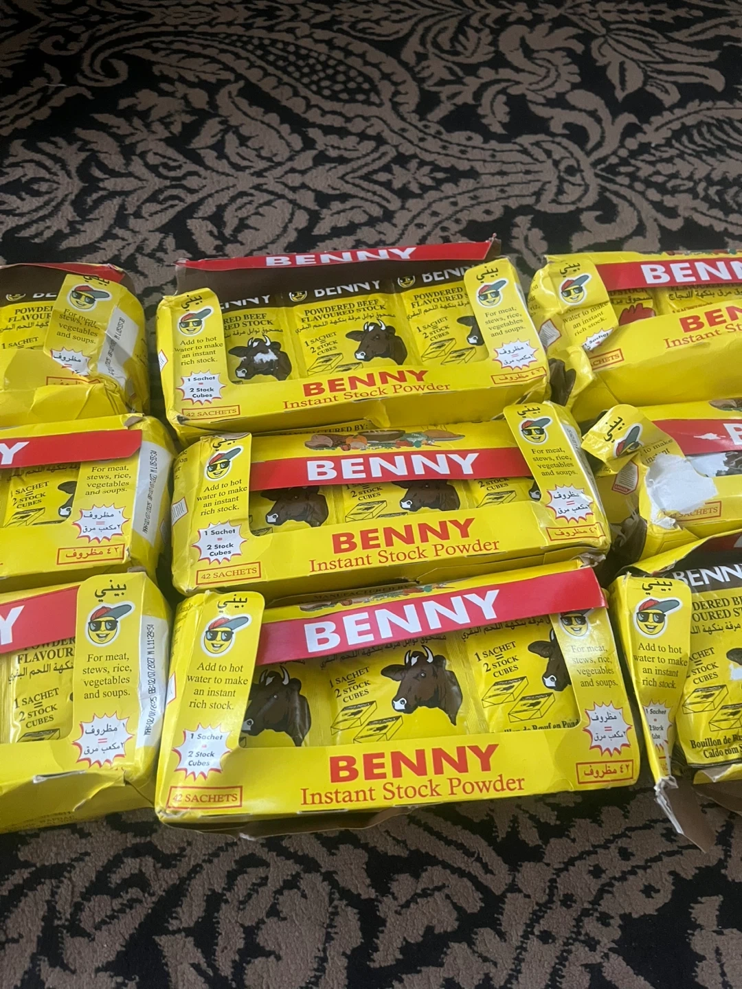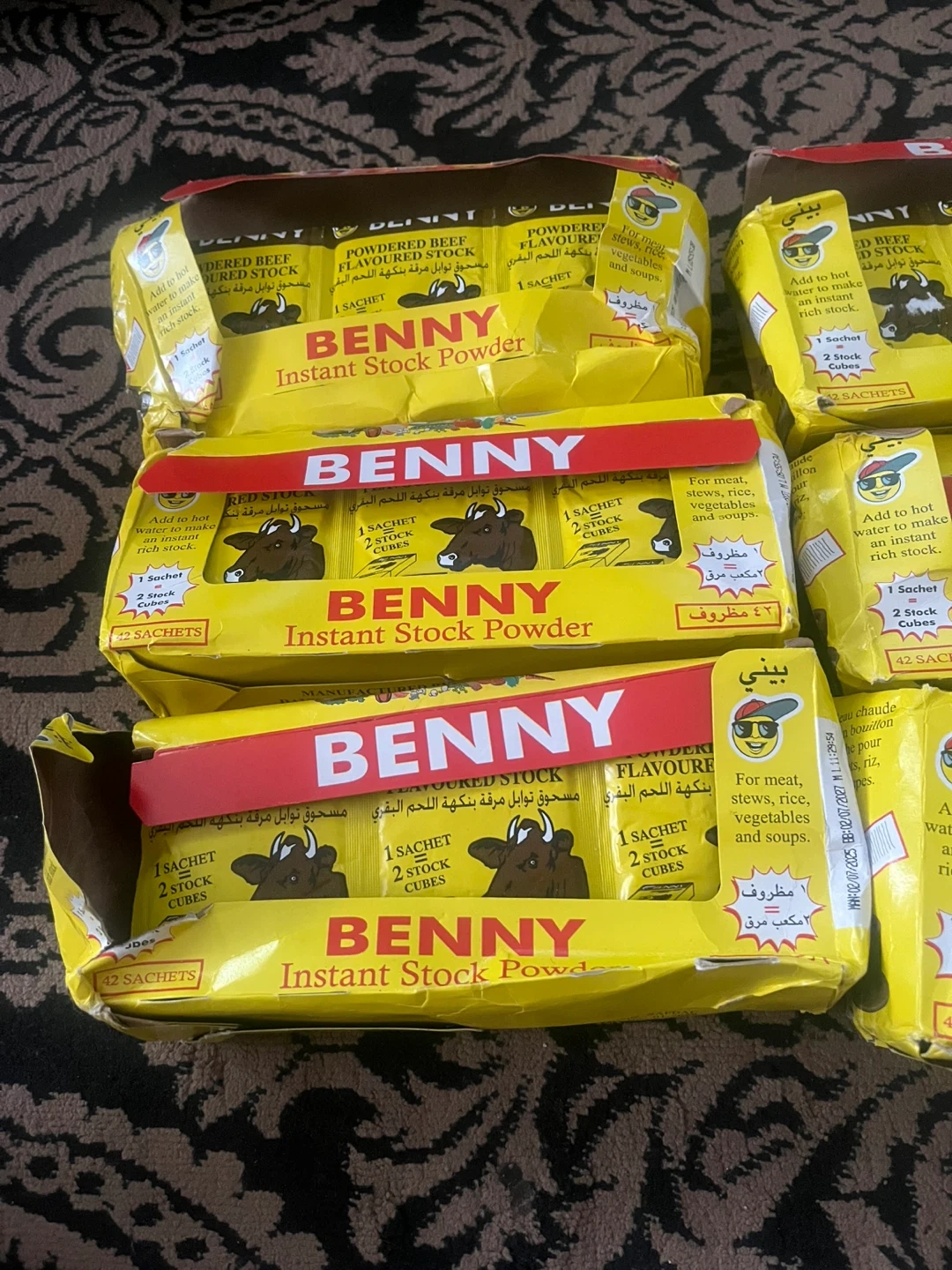 Benny Instant Stock Powder for meat, stews, rice, vegetables and soups. Each box contains 42 sachets. Expiry Date: 2027 July 02. For one packet it’s $1.00, but if you want the full box, it’ll be $40.00
