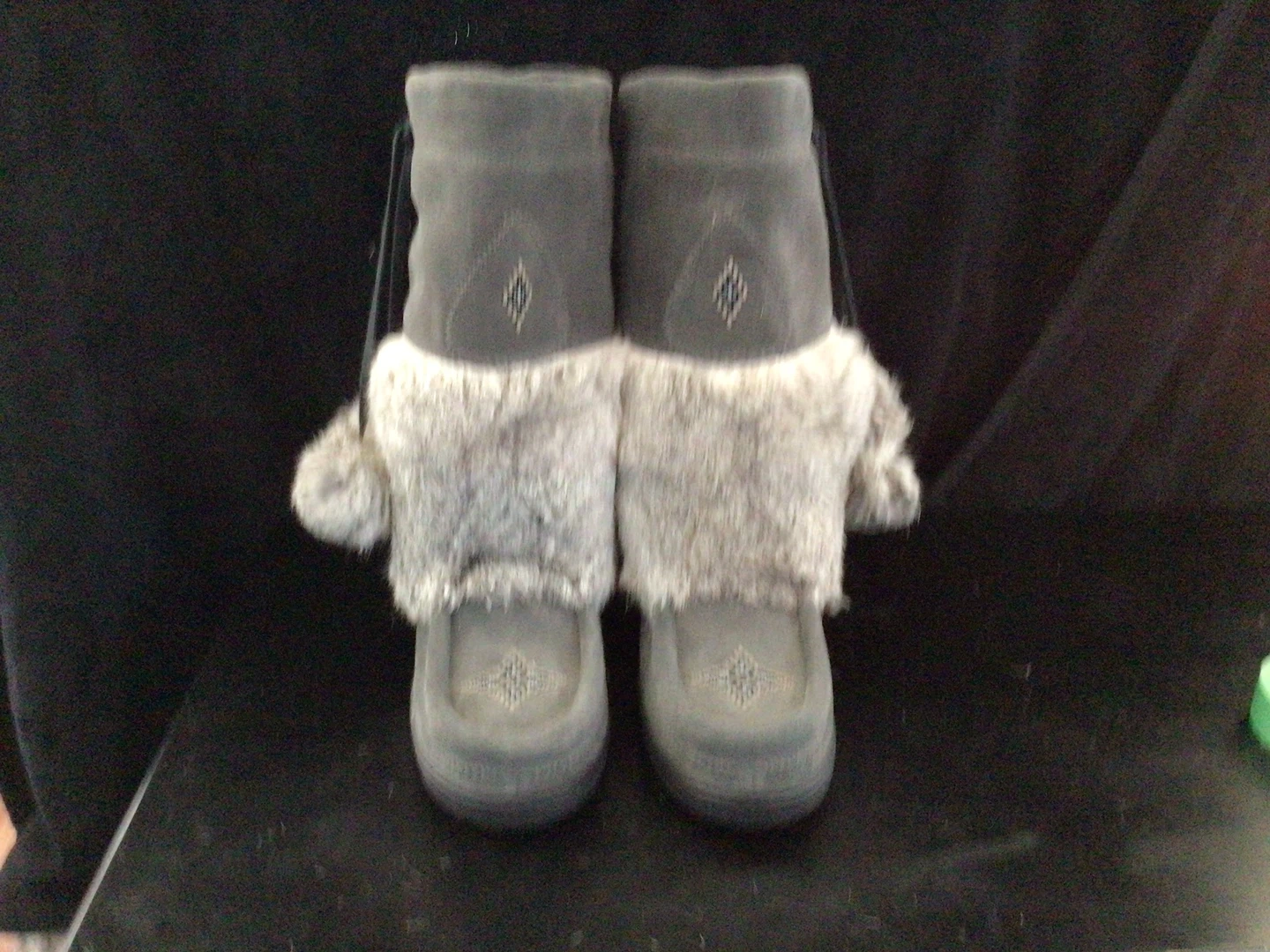 Beautiful handmade in Canada. Fur lined rabbit and suede, beaded boots. Super warm and comfy, good in snow and rain.
