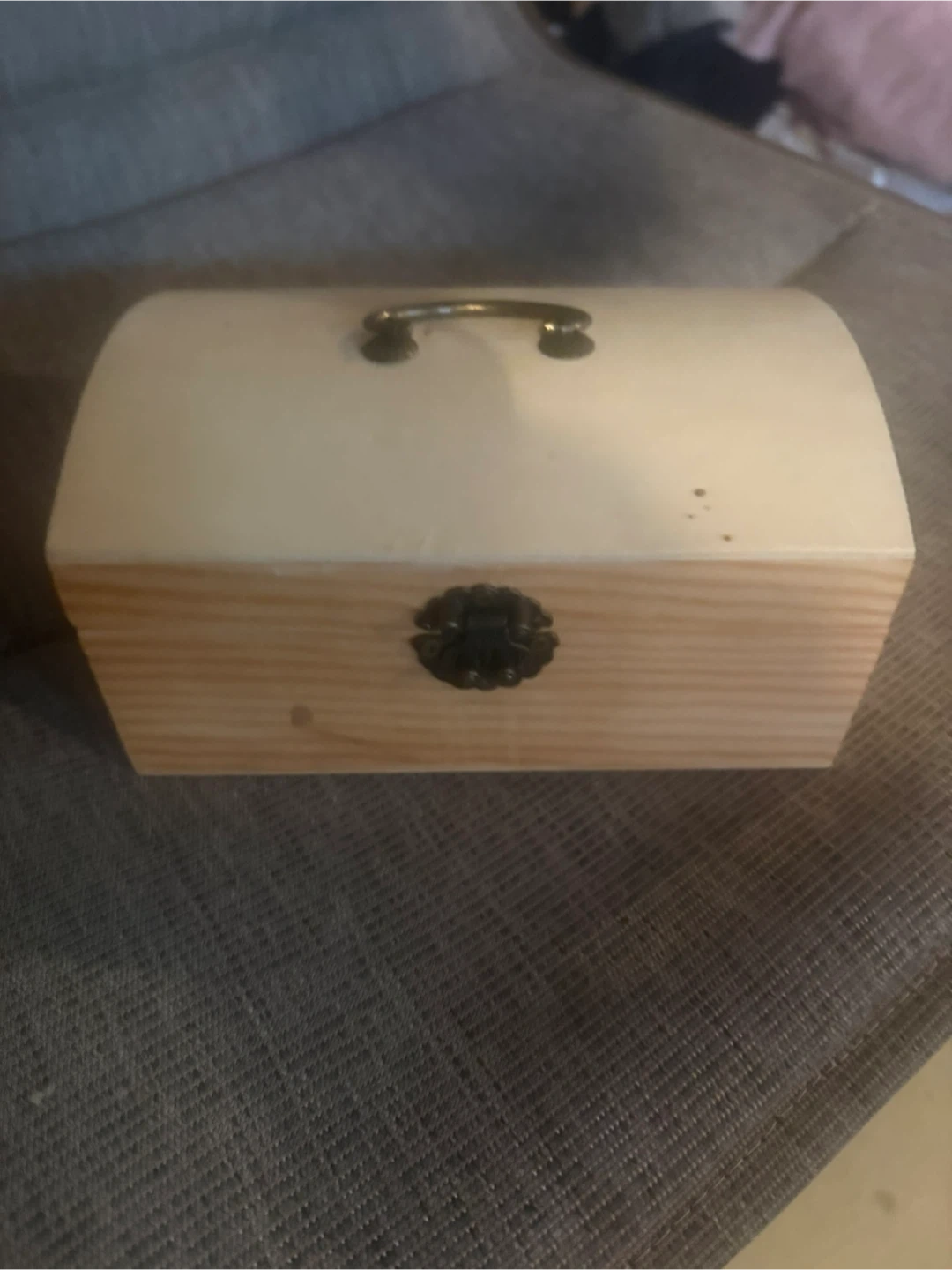 A charming wooden box, perfect for adding a touch of rustic elegance to your space. It features a handle on top and a decorative clasp on the front. The inside is empty and ready to be filled with your treasures or used as a decorative accent