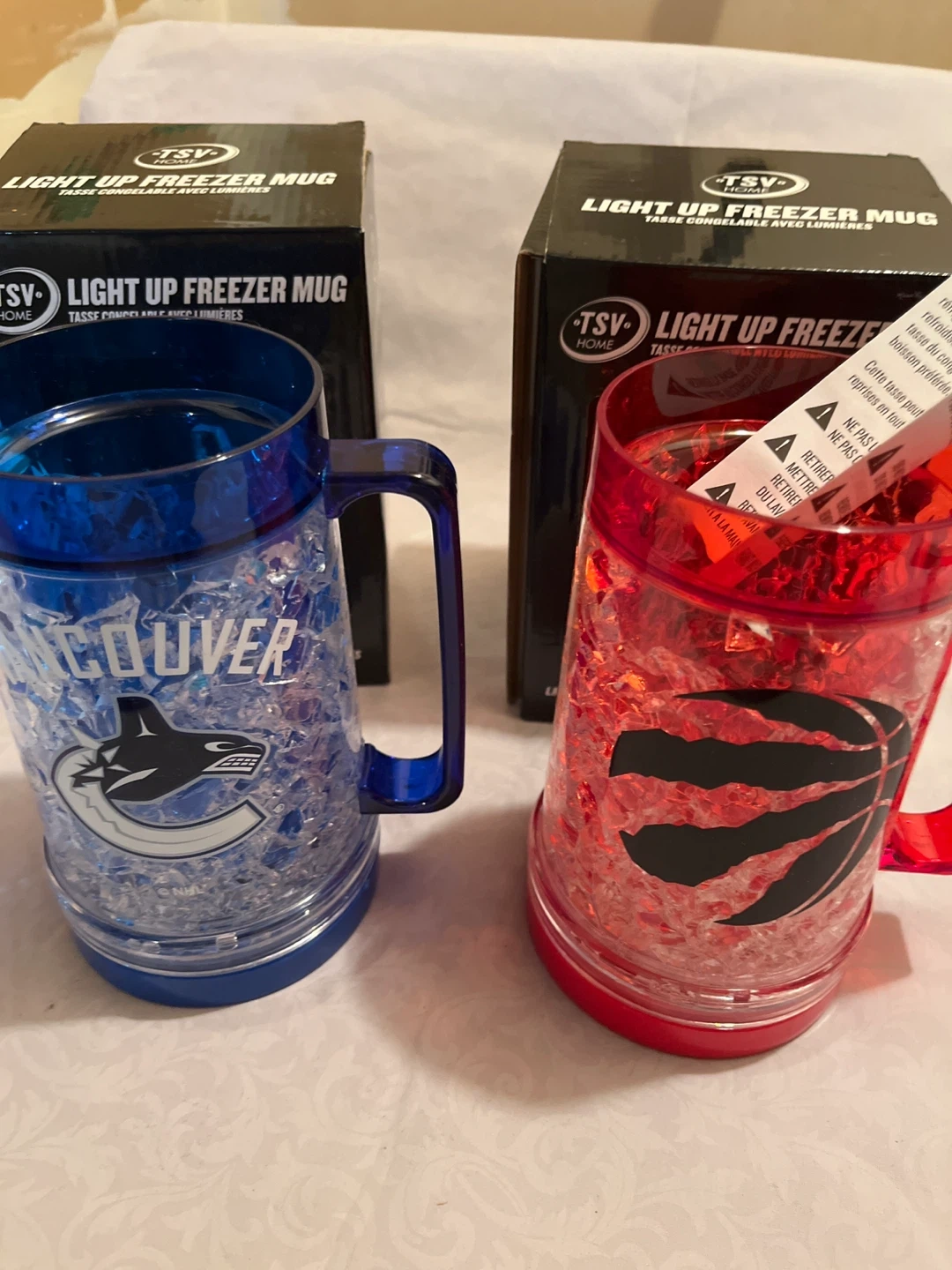 Selling two TSV Home Light Up Freezer Mugs! One features the Vancouver Canucks logo and the other has the Toronto Raptors logo. Perfect for keeping your drinks cold while showing off your team spirit. Cash only $10 each