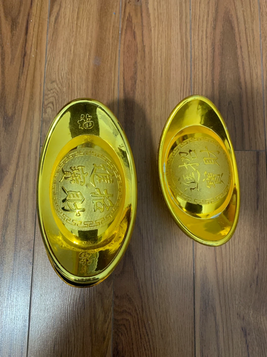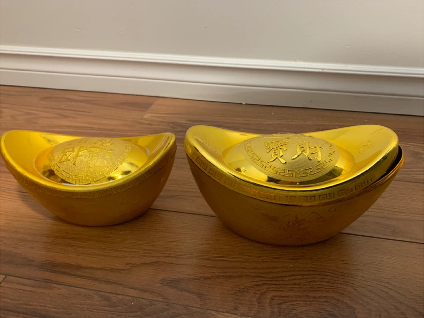 Selling a set of two gold ingot figurines. They're in great shape and would be perfect for decoration or as a gift!
