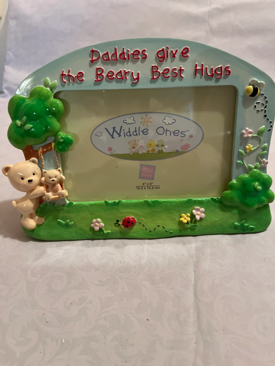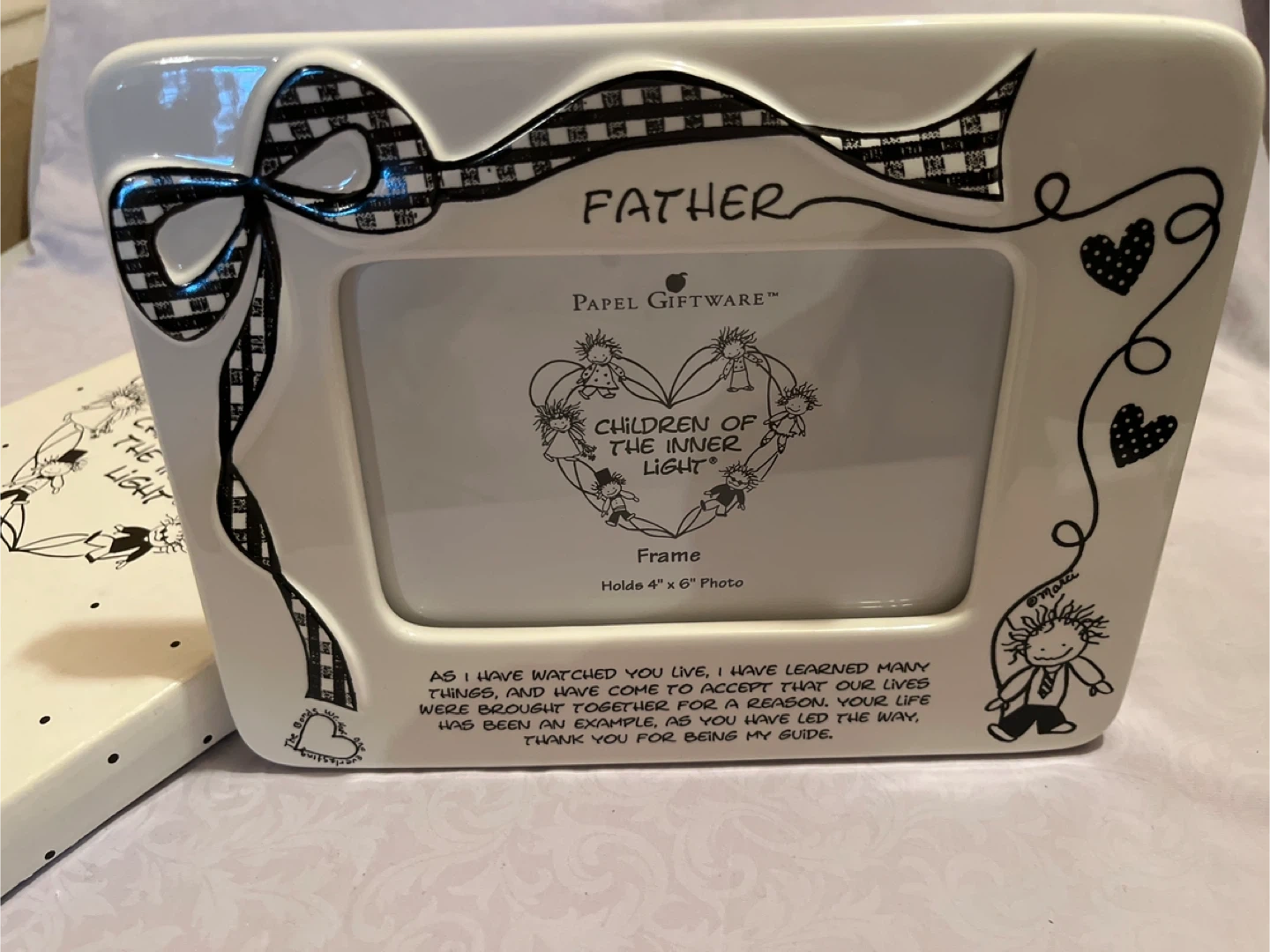 Papel Giftware photo frame with a sweet 'Father' theme! It's designed to hold a 4x6 inch photo. The frame features a charming design with children and hearts, and a heartfelt message. It also comes with its original box! Also Widdle Ones $10 each Cash only please.
