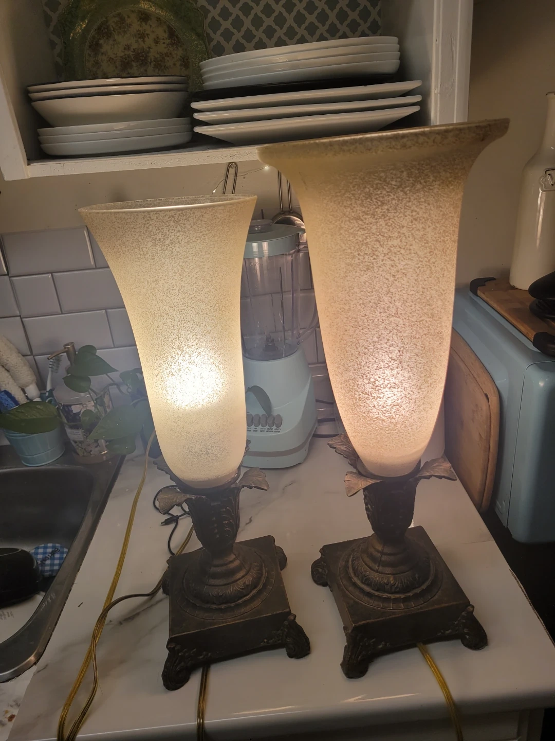 Selling a pair of vintage table lamps. They have a beautiful, ornate base and a frosted glass shade that gives off a warm glow. Perfect for adding a touch of elegance to any room!