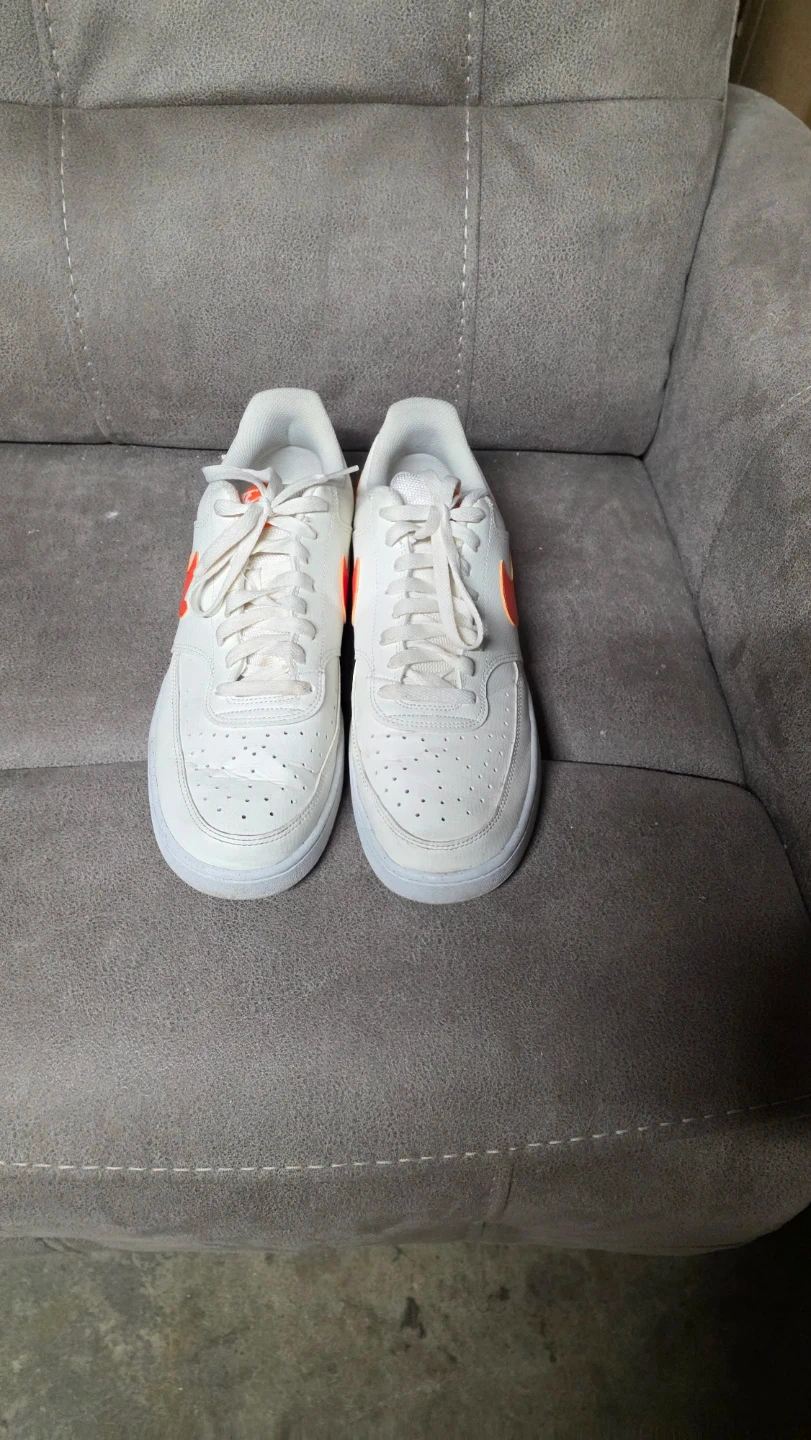 These Nike Court Vision Low sneakers are in great condition! They feature a classic design with a white leather upper and a vibrant orange Nike swoosh. Perfect for everyday wear or adding a sporty touch to your outfit