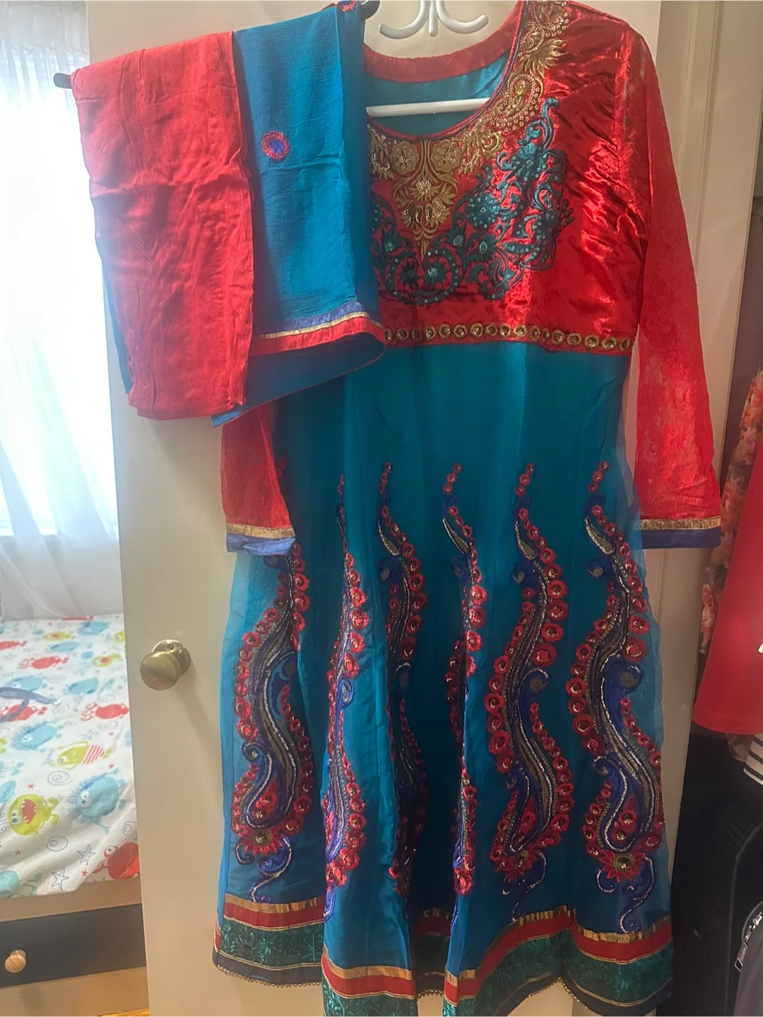 Beautiful Anarkali dress in red and blue with intricate embroidery. Perfect for special occasions!