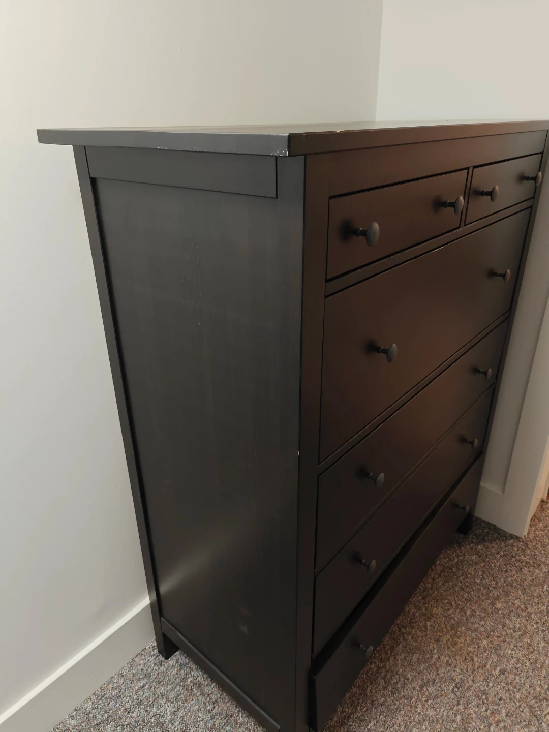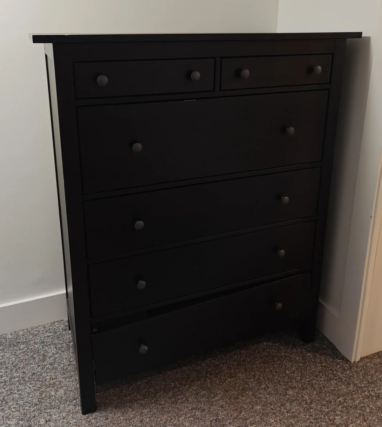 Selling a black IKEA Hemnes dresser. It has some damage, as one of the bottom drawers is broken. Otherwise, it's a great dresser with lots of storage space! Perfect if you're looking for a project or need extra storage and don't mind the damage