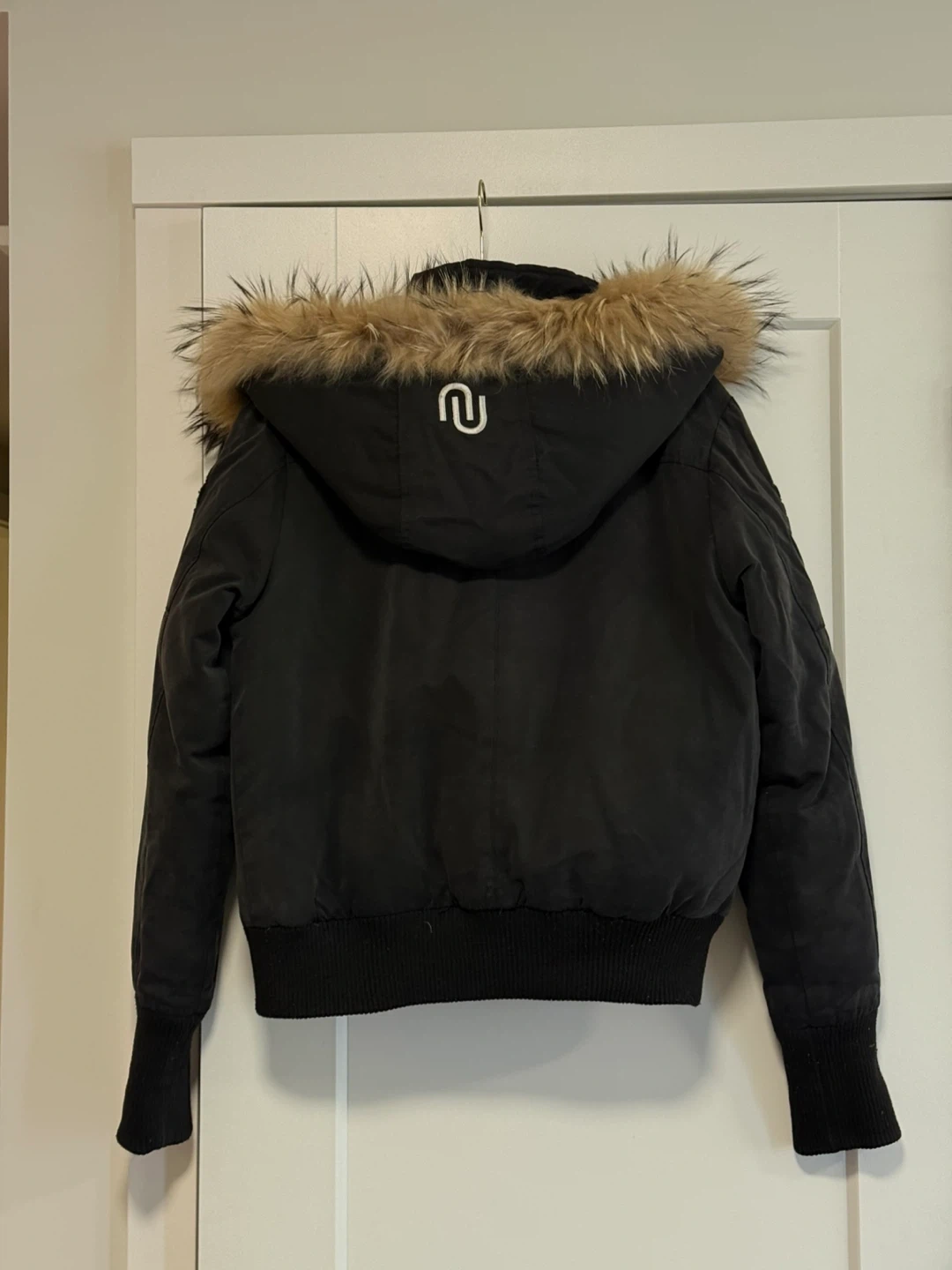The outer shell is made of 51% cotton, 39% polyester, and 10% nylon. The lining is 100% nylon, and the filling is 60% down and 40% feather. The fur is raccoon fur