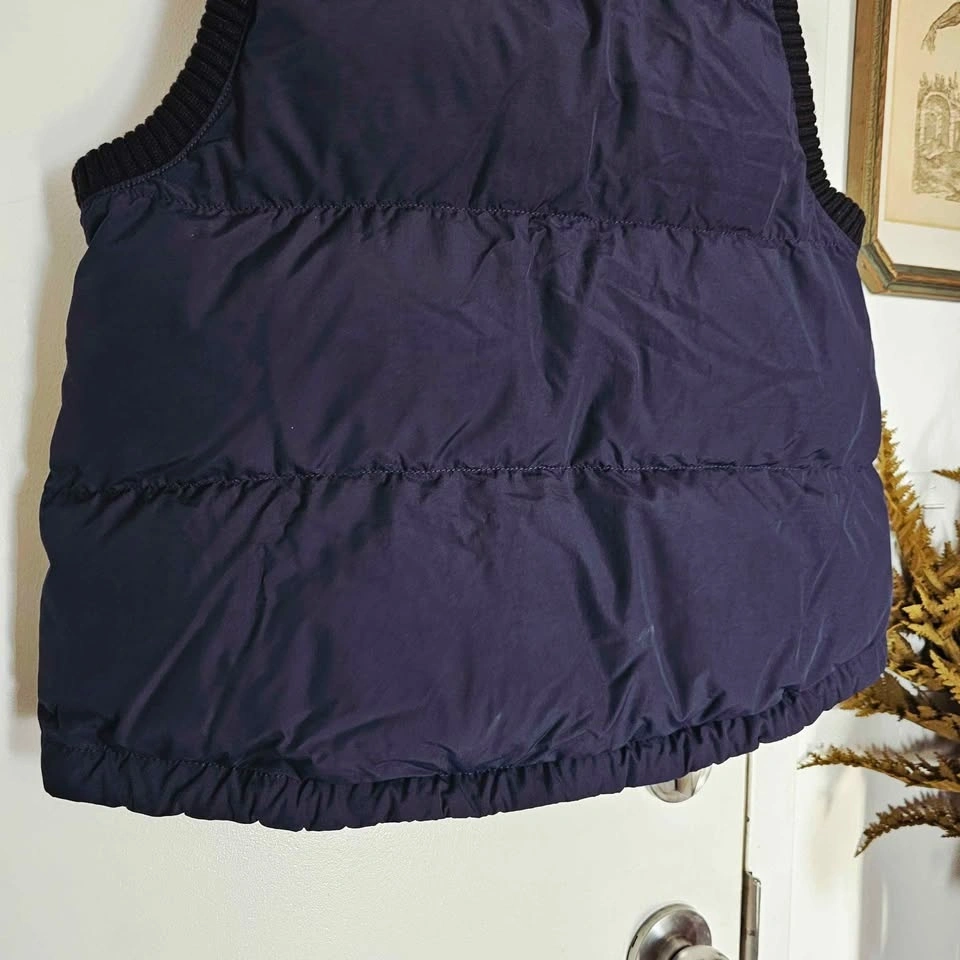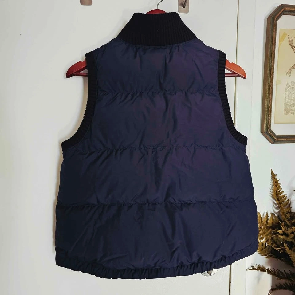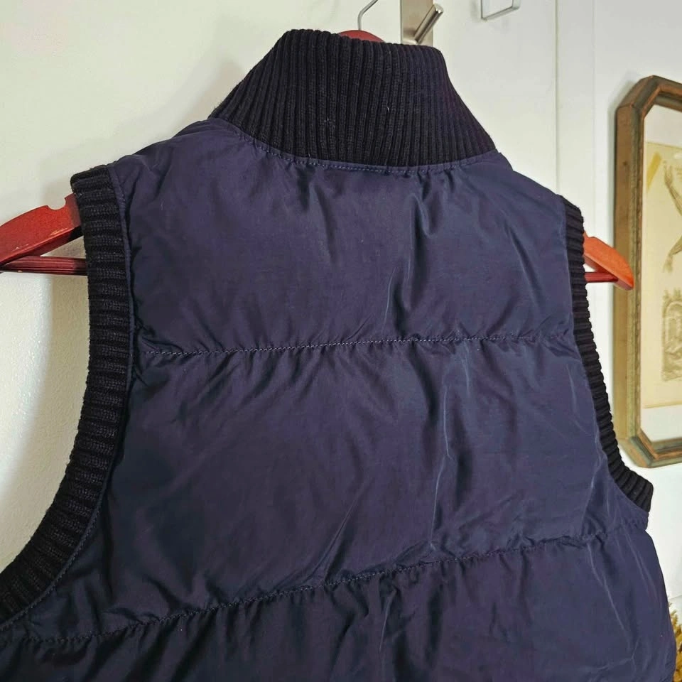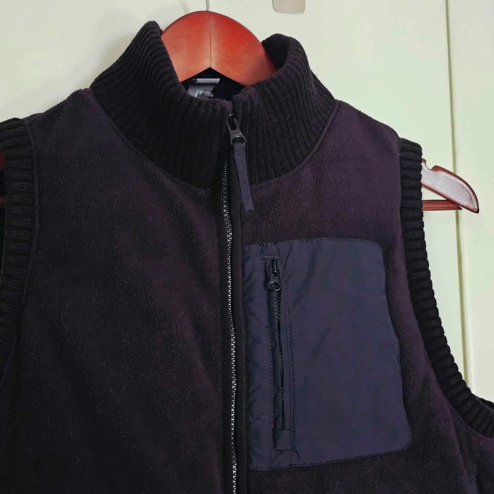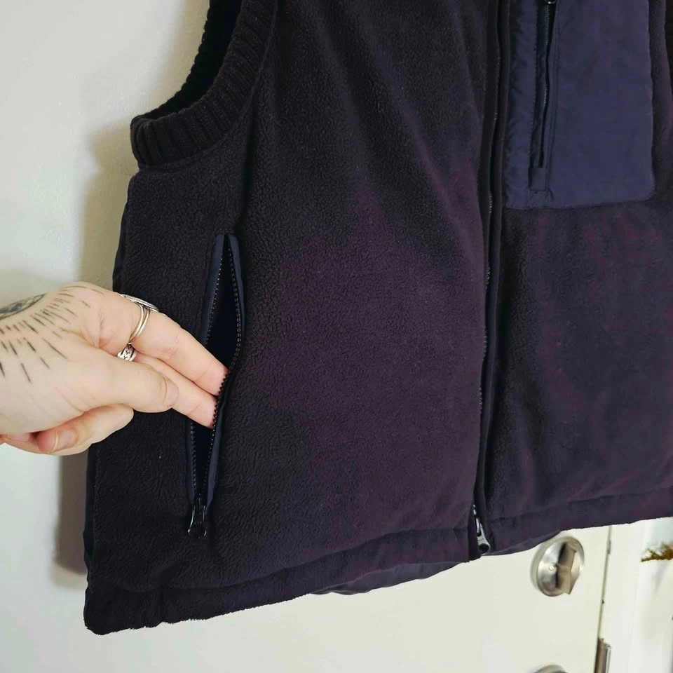 Vest has a somewhat cropped and boxy cut. It has a high chunky ribbed knit collar and matching ribbed knit around the armholes and bottom. Full-length zipper, a zippered contrast patch pocket at the chest, and 2 zippered side pockets. Vest is padded with insulation in front and back, but the front outer material is fleece and the back is quilted puffer style. There are drawstrings at the bottom to cinch if desired.