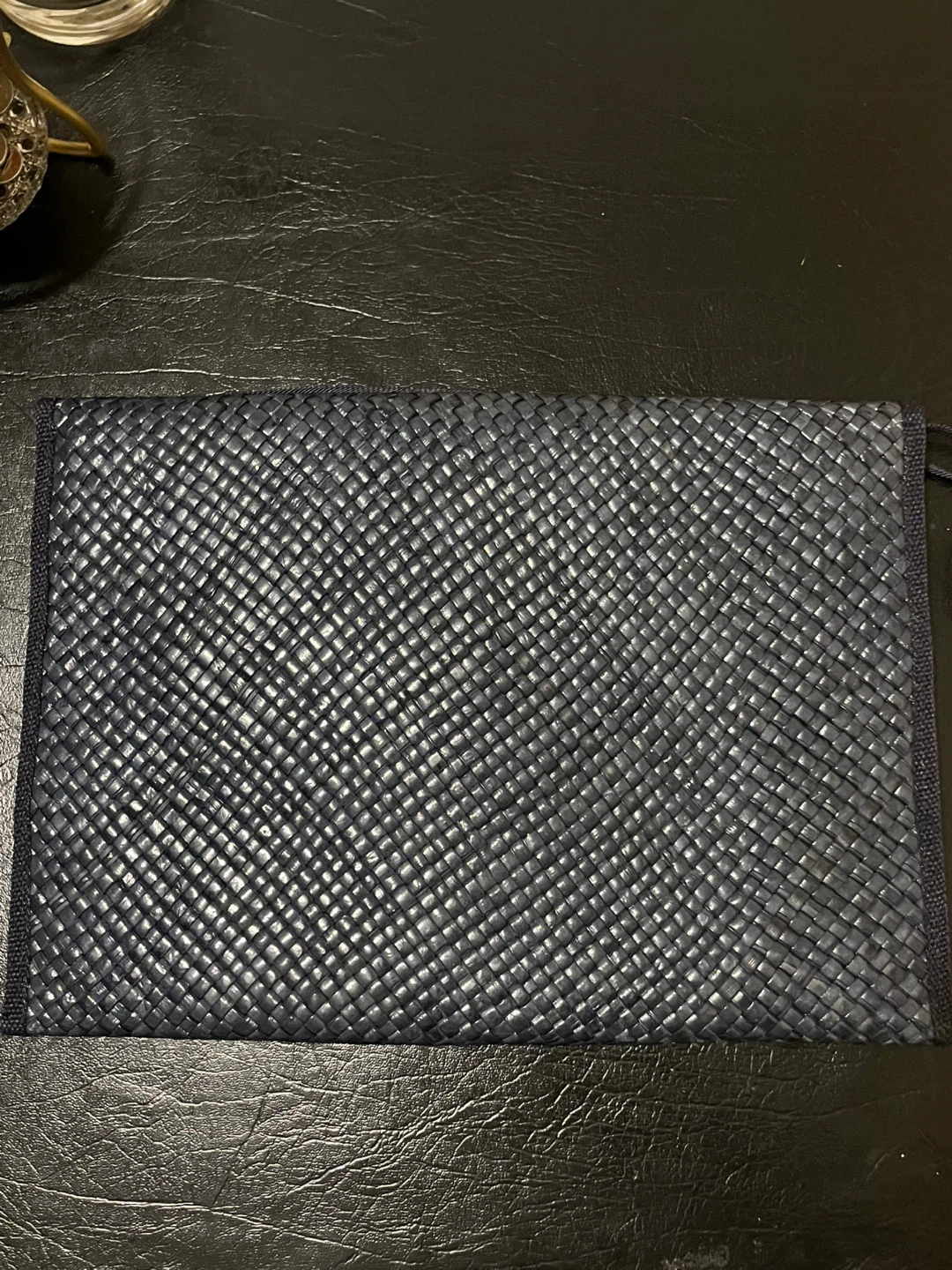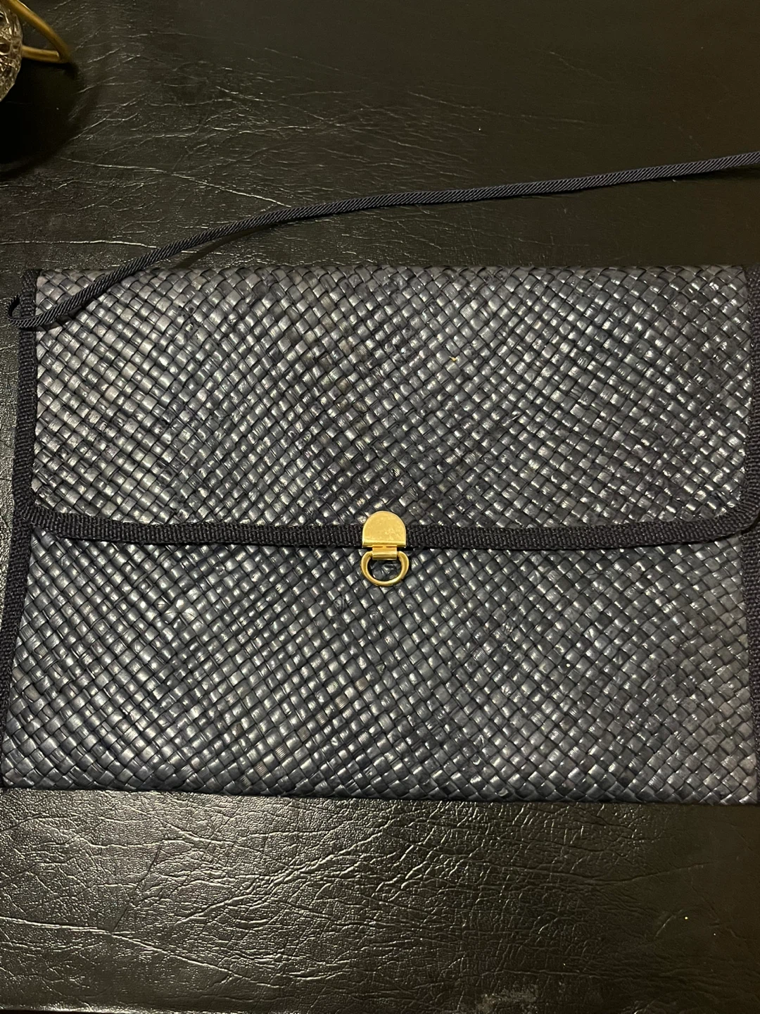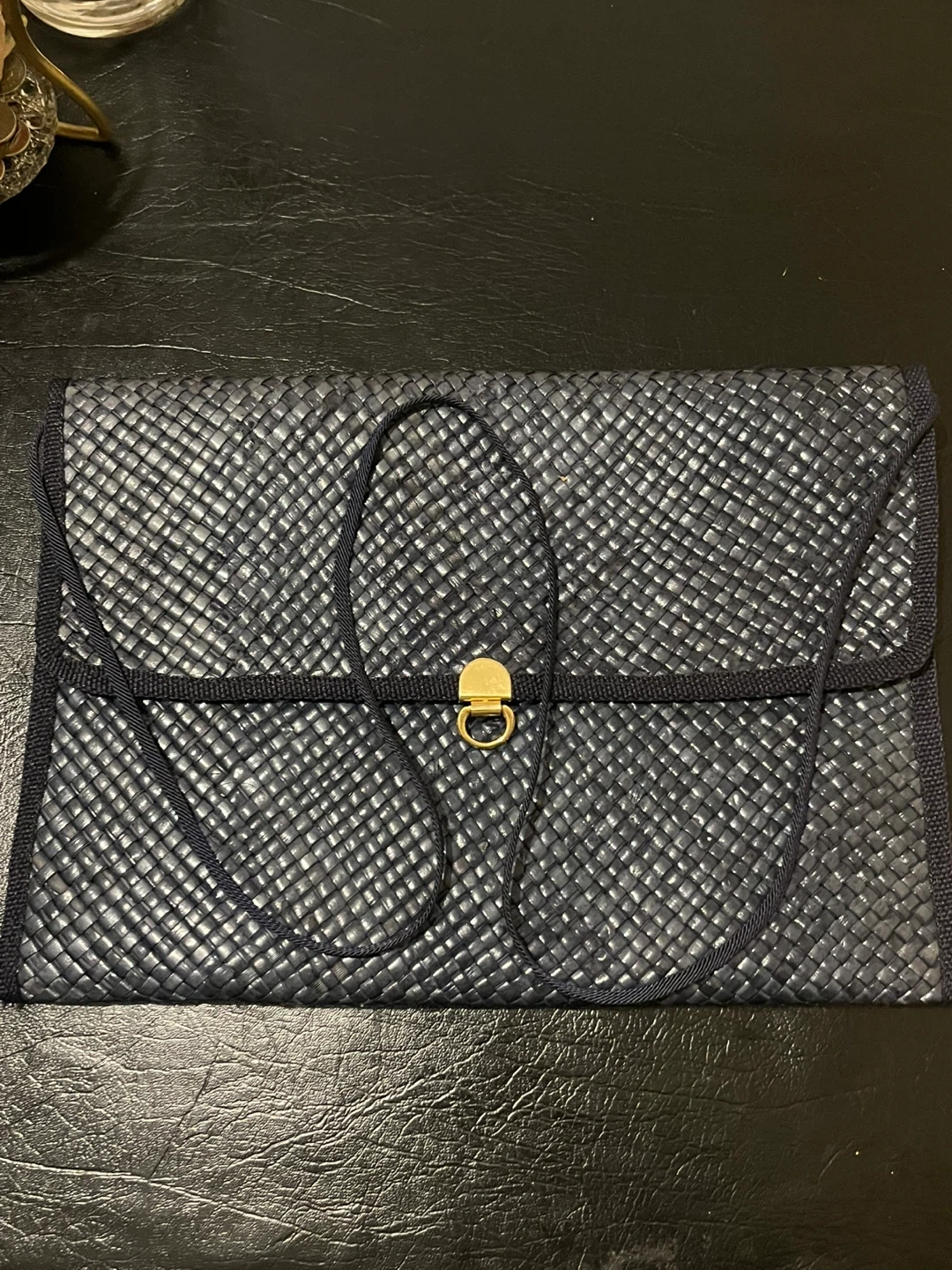 Selling a navy woven clutch purse. It's in great condition and ready for a new owner! The purse has a unique woven texture and a classic design, perfect for evenings out or special occasions