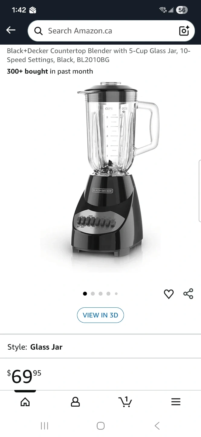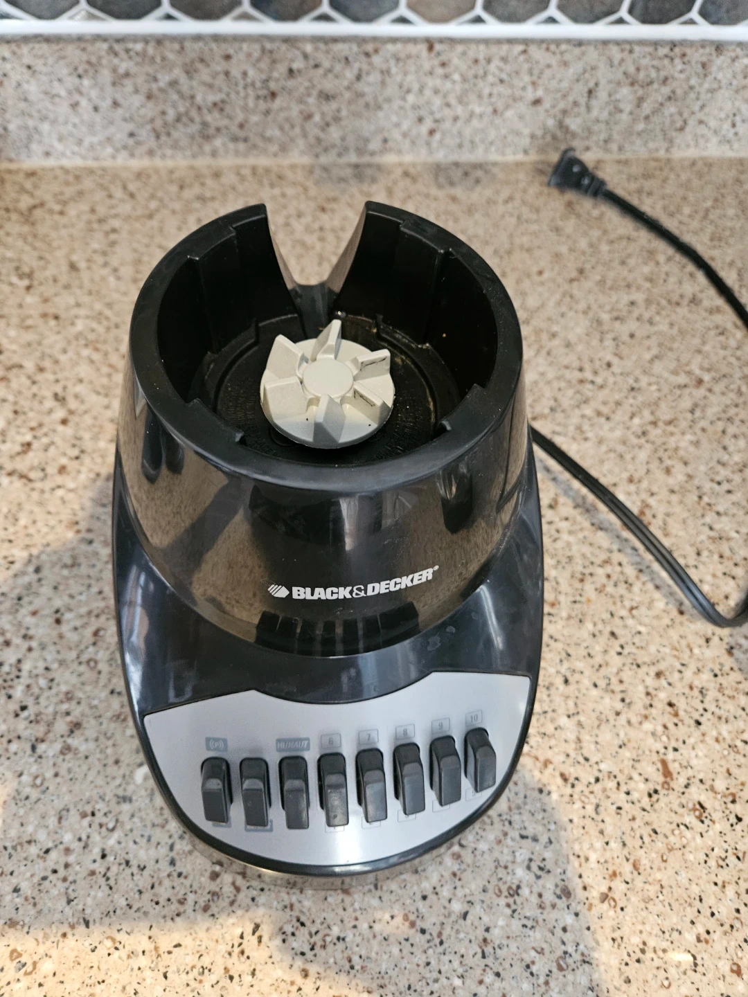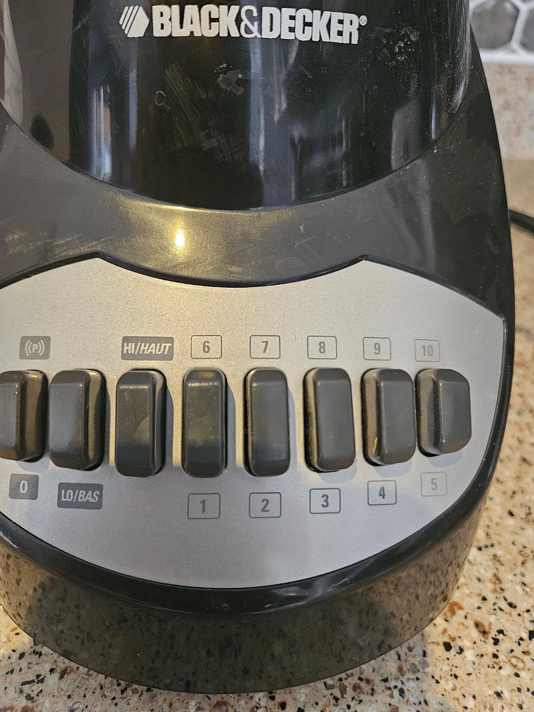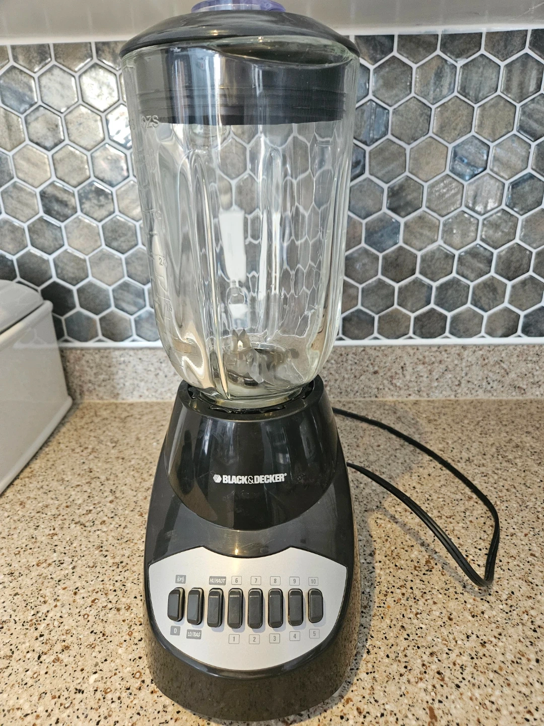 Selling a Black+Decker countertop blender with a 5-cup glass jar. It has 10-speed settings, perfect for all your blending needs! The model number is BL2010BG. Originally bought for $69.95.