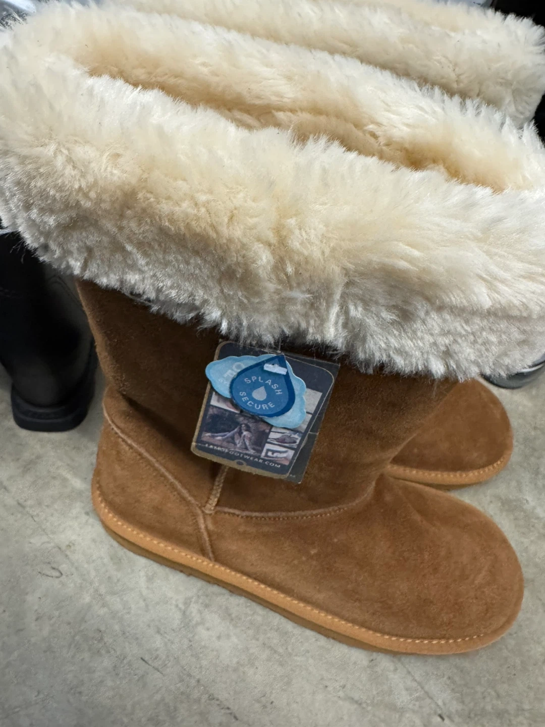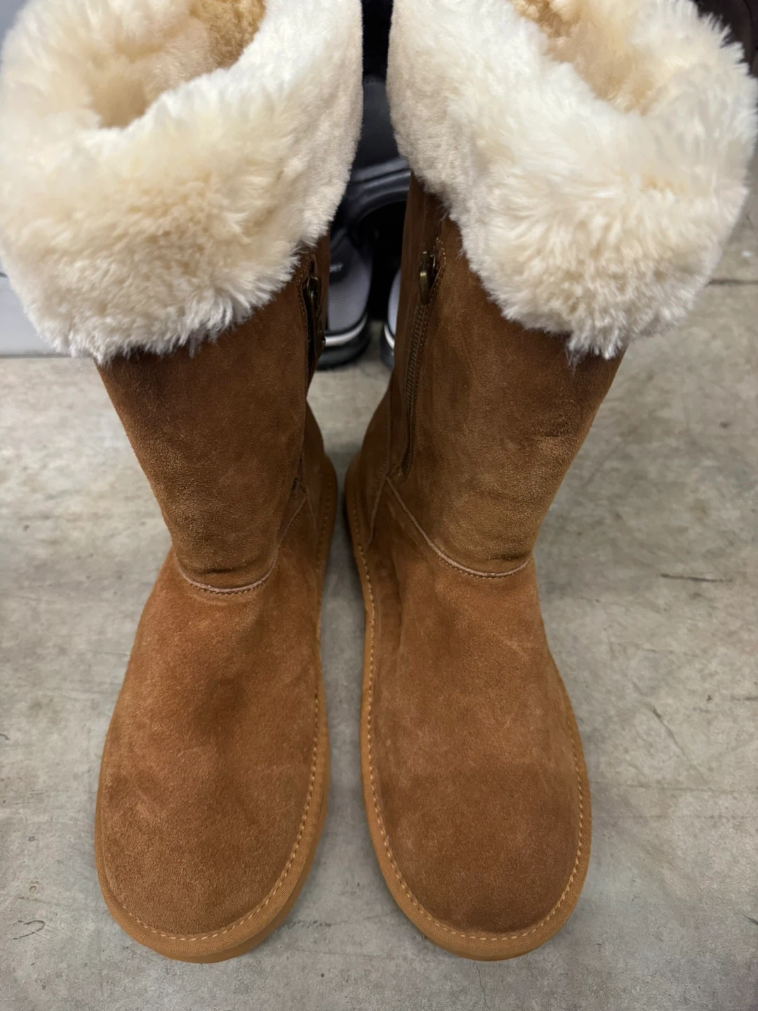 Cozy Tamarac boots in a lovely brown suede with a plush fur trim! These are perfect for keeping your feet warm and stylish during the colder months. They feature a convenient side zipper for easy on and off. Great for everyday wear!