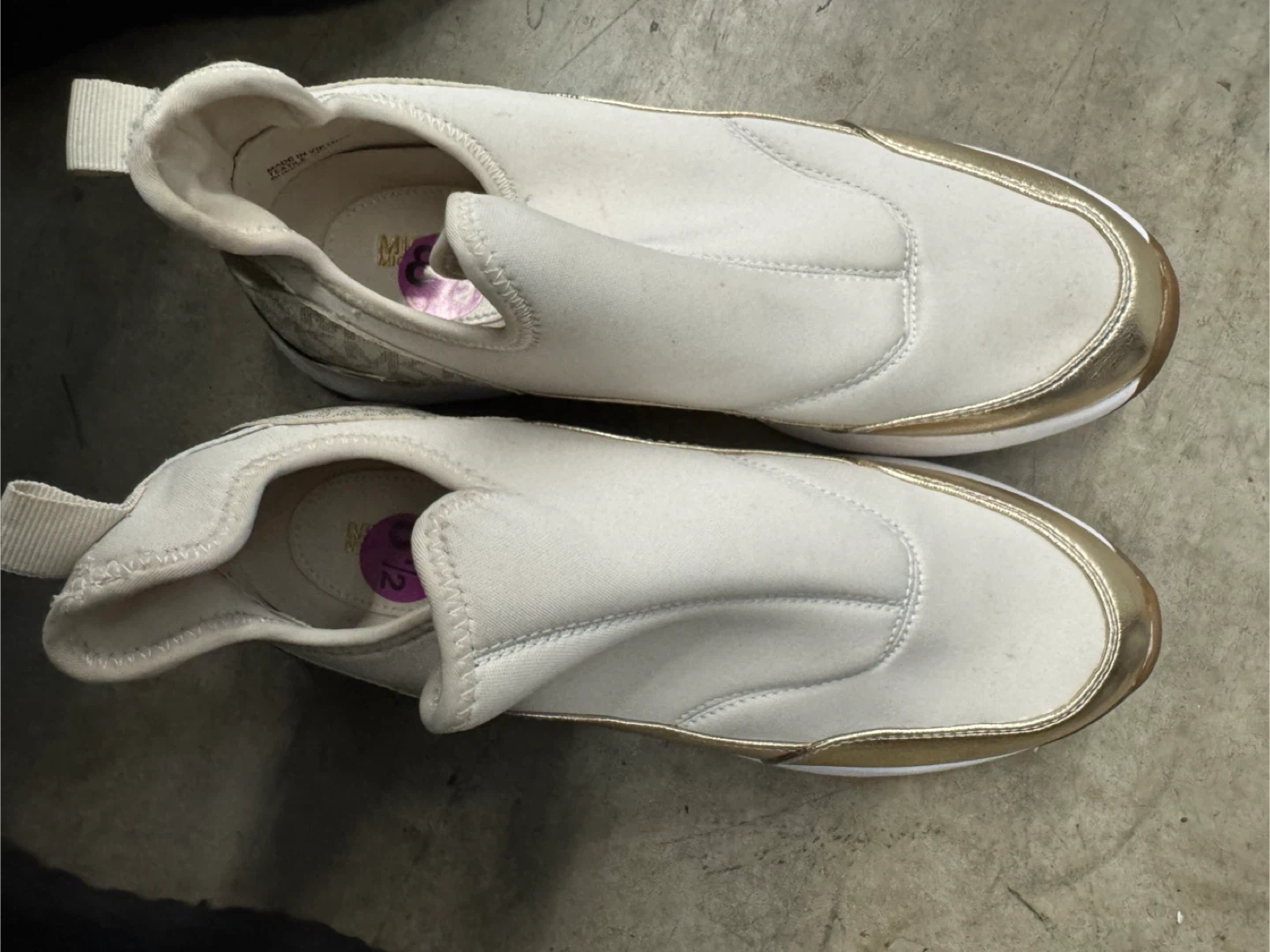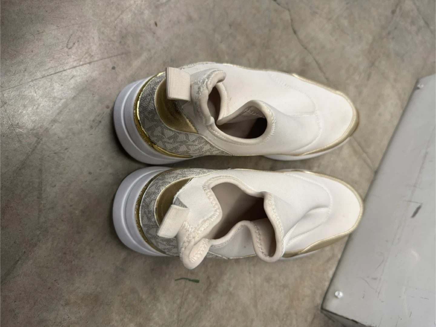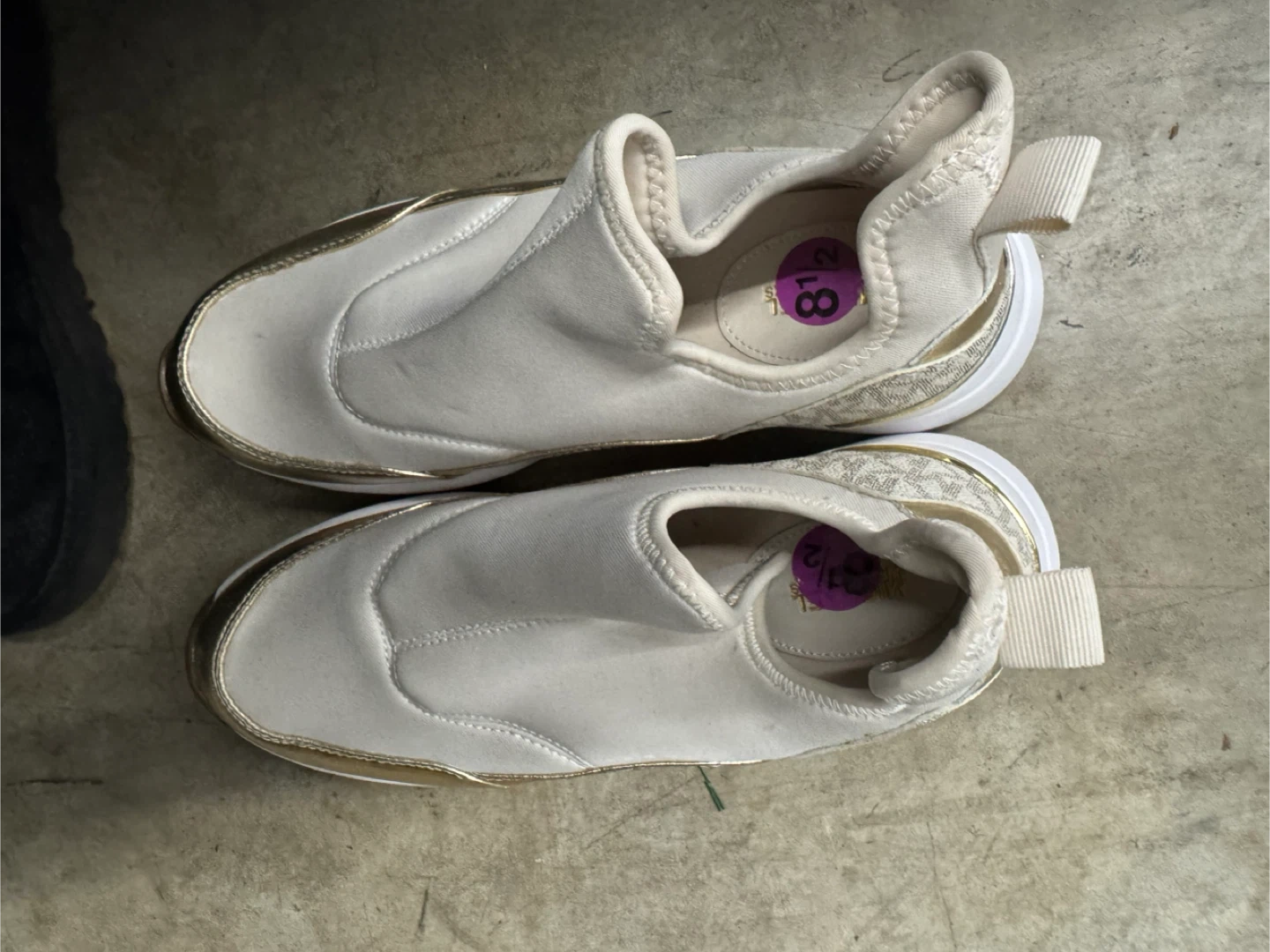 Selling a pair of Michael Kors slip-on sneakers in a size 8.5. These are a stylish and comfy choice for everyday wear. They feature a sleek design with gold accents, adding a touch of elegance to your casual look. Perfect for running errands or just relaxing!