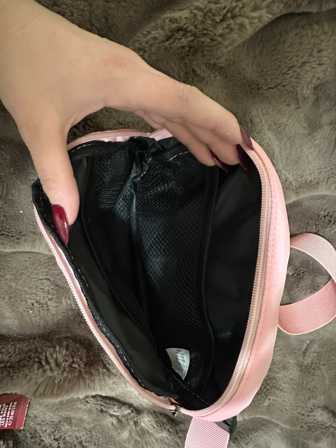 It's in great condition and perfect for carrying your essentials. The interior has a black mesh lining.