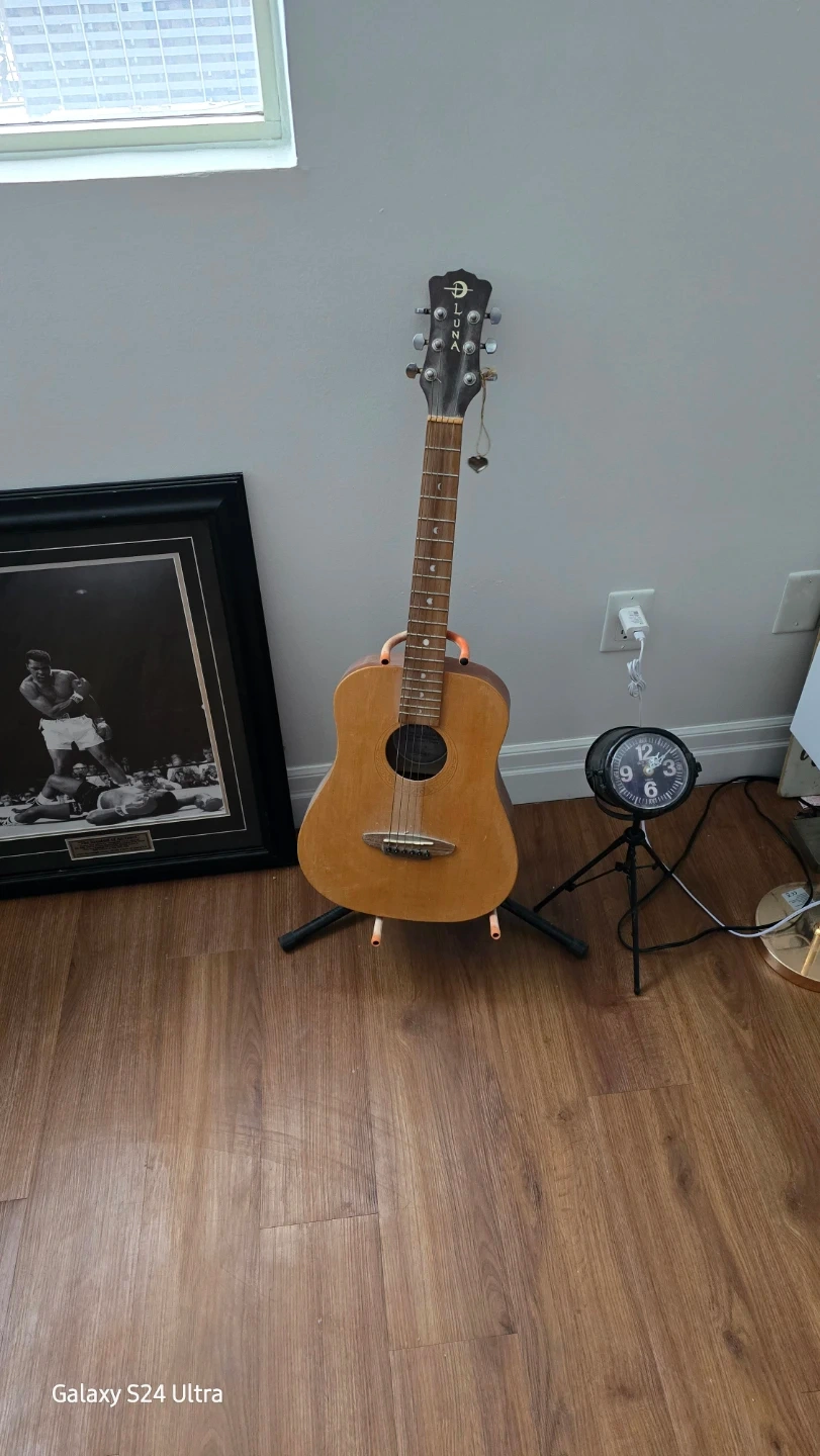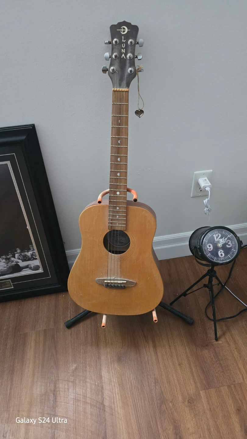 Selling a Luna Aurora 3/4 size acoustic guitar. It's in good condition and perfect for beginners or someone looking for a smaller-bodied guitar. The Luna brand is known for its quality instruments and beautiful designs. This guitar has a comfortable feel and a nice sound. Would be great for a child learning to play! Also comes with a black amplifier. Does come with one broken string. However the pkg is sold together. New price....
