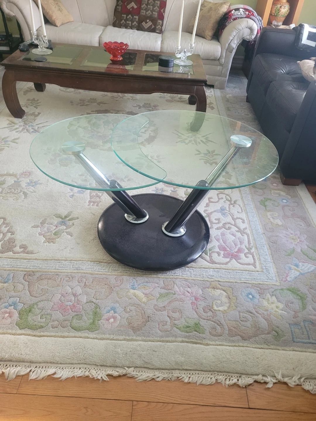 Selling a round glass coffee table with a black base. It rotates to make 2 different sizes. It's in great shape and would look lovely in any living room!