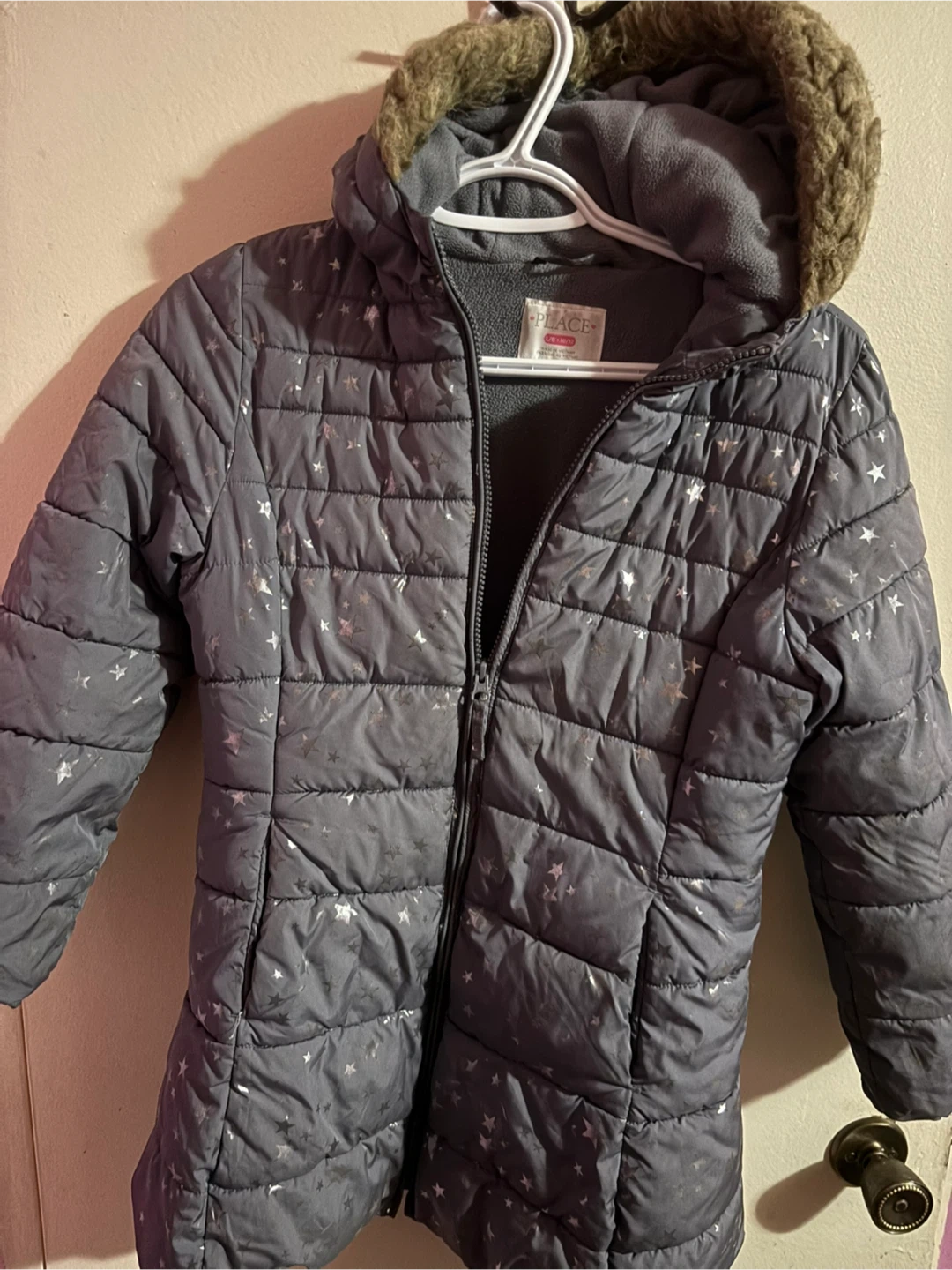 Cozy puffer jacket from The Children's Place, perfect for keeping your little one warm! It's a size L (10/12) and features a stylish design with a furry hood. Great for those chilly Canadian days!