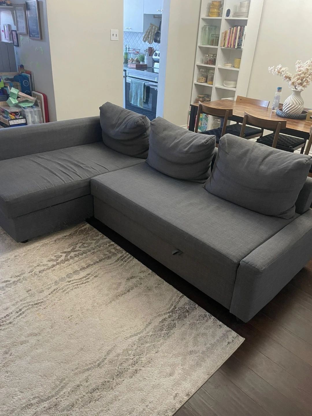 Selling a comfortable grey sectional sofa. It's in good condition and ready for a new living room! The sectional design offers plenty of seating space, perfect for lounging or entertaining guests. It features soft cushions for added comfort.