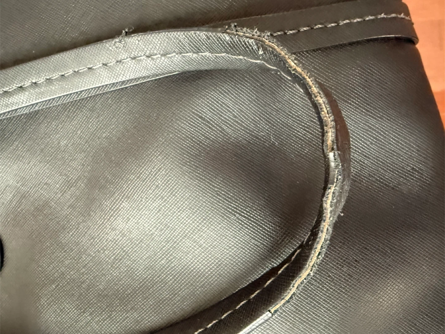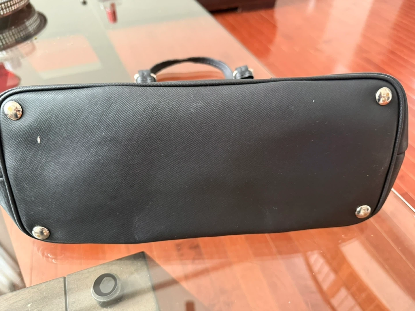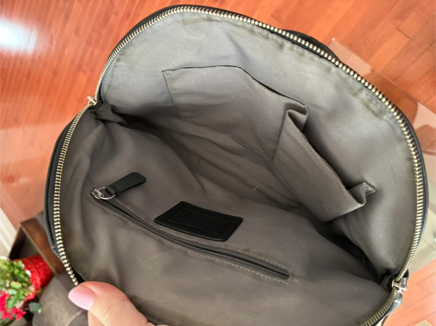 The interior is lined with fabric and includes one zip pocket and two slip pockets. Shows signs of use. See photos.